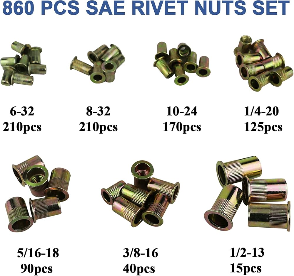 TR TOOLROCK 860 قطعة SAE مجموعة متنوعة من صواميل البرشام ومجموعة مسدس صامولة 13 بوصة، SAE UNC 6#-32 8#-32 10#-24 1/4"-20 5/16"-18 3/8"-16 1/ 2 "-13، مجموعة صامولة برشام مع حقيبة حمل متينة