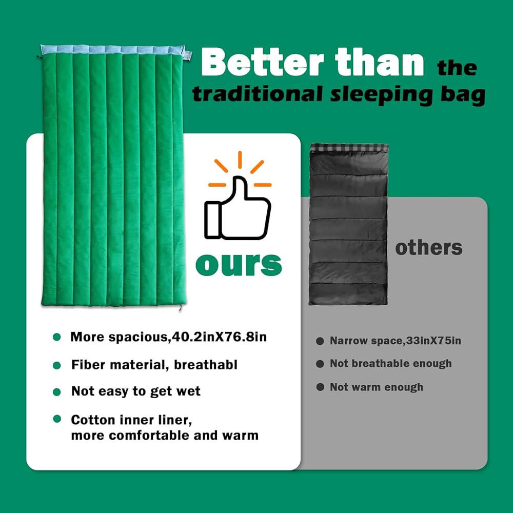 Size and Comfort: Designed for superior comfort, these sleeping bags are spacious and feature soft linings, accommodating various body sizes and sleep styles, making them almost as comfortable as a bed.