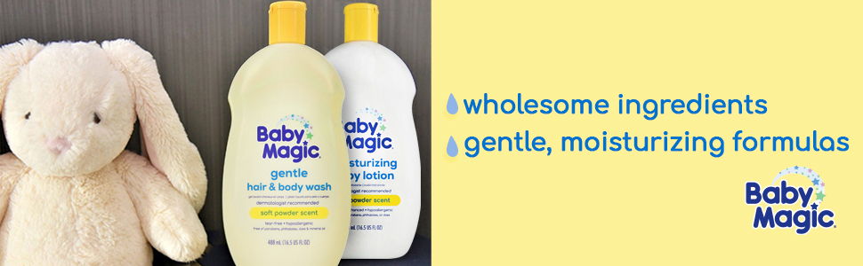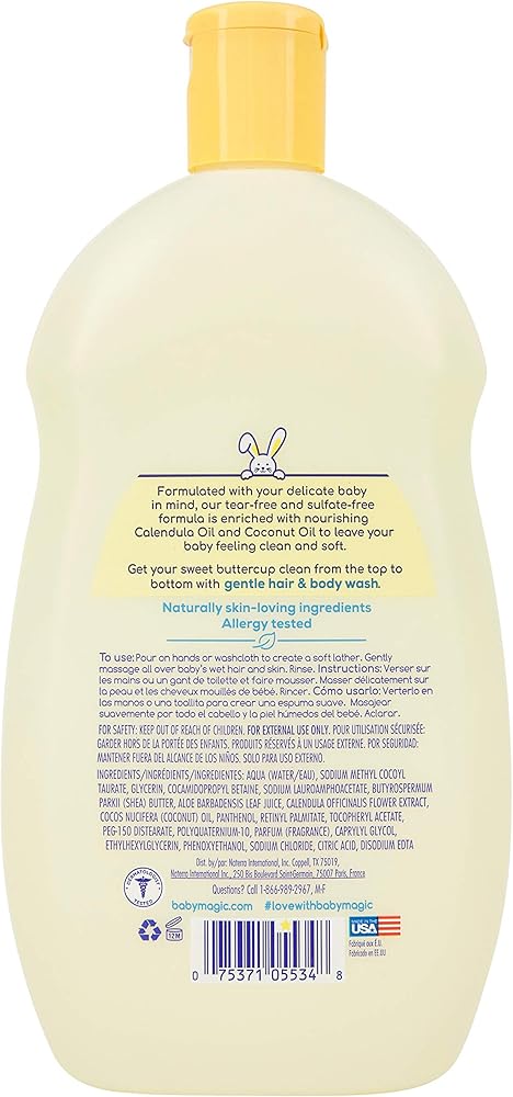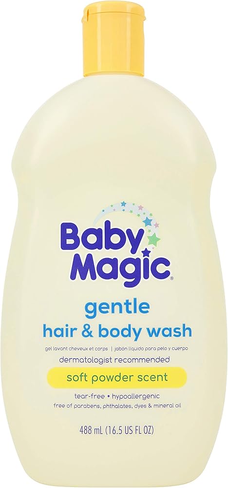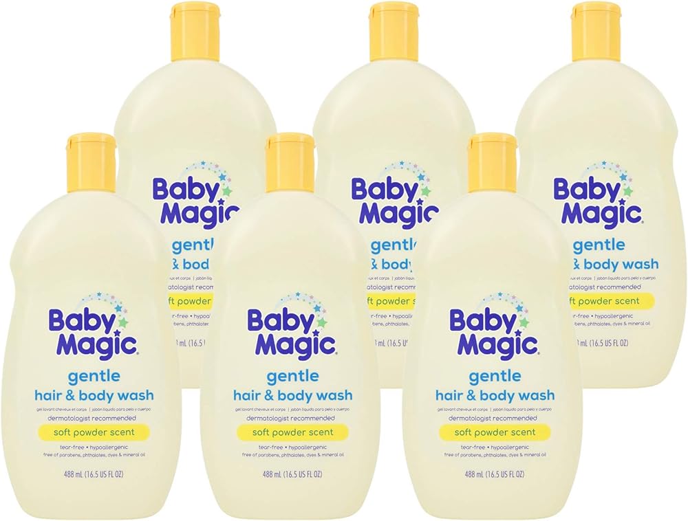 Baby Magic Gentle Hair Body Wash 16.5oz Pack of Calendula Oil Coconut Oil, Yellow, Soft Powder Scent, 6 Count is our Original formula with a light scent formulated especially for sensitive skin. This easy-rinse, vitamin enhanced baby wash gently cleanses your baby's skin and avoids irritation and dryness. Features: Soft powder and floral scent. Enriched with vitamins and aloe.Gluten-Free. Tear-Free. Dye-Free. Phthalate-Free. pH balanced. Hypoallergenic. Dermatologist tested. Directions: With warm water use Baby Magic Baby Hair & Body Wash to gently bathe your little one clean. Pour on hands or washcloth and gently massage all over baby's skin and hair to lather. Available in 30 oz, 16.5 oz, 9 oz & 2 oz. Keep out of reach of children. For external use only.