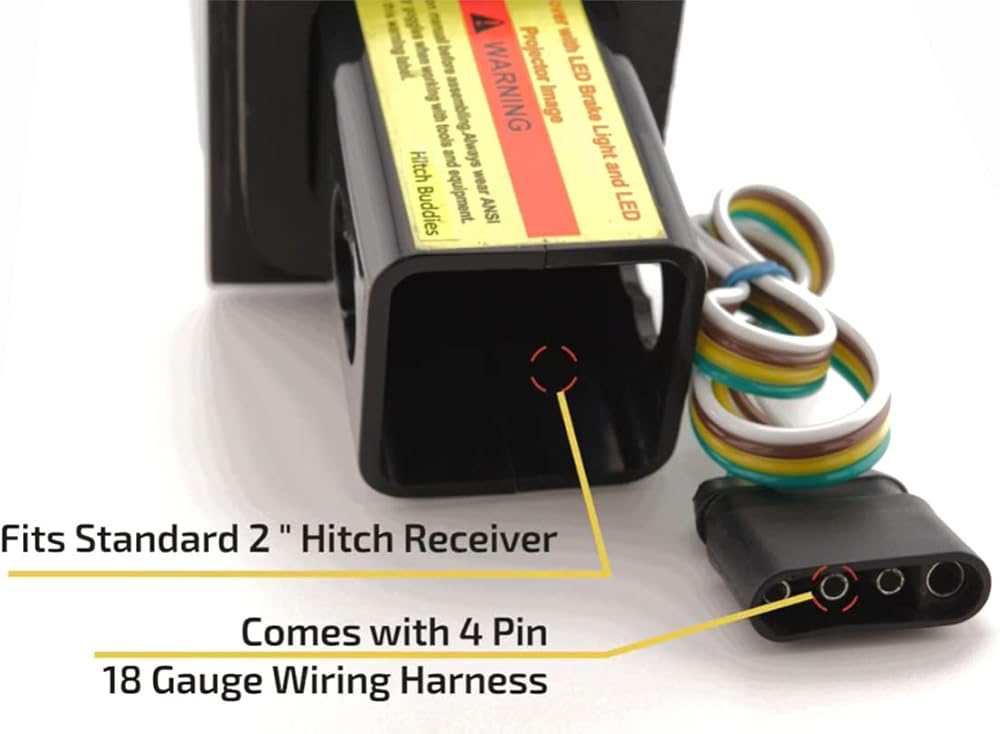 يتم تركيبه بسرعة: قم بتمرير أغطية وصلة السحب داخل مستقبل الربط وتأمينها باستخدام دبوس ربط (غير متضمن)، ثم قم بتوصيل الموصل الكهربائي ذو 4 دبابيس بالموصل الموجود في سيارتك