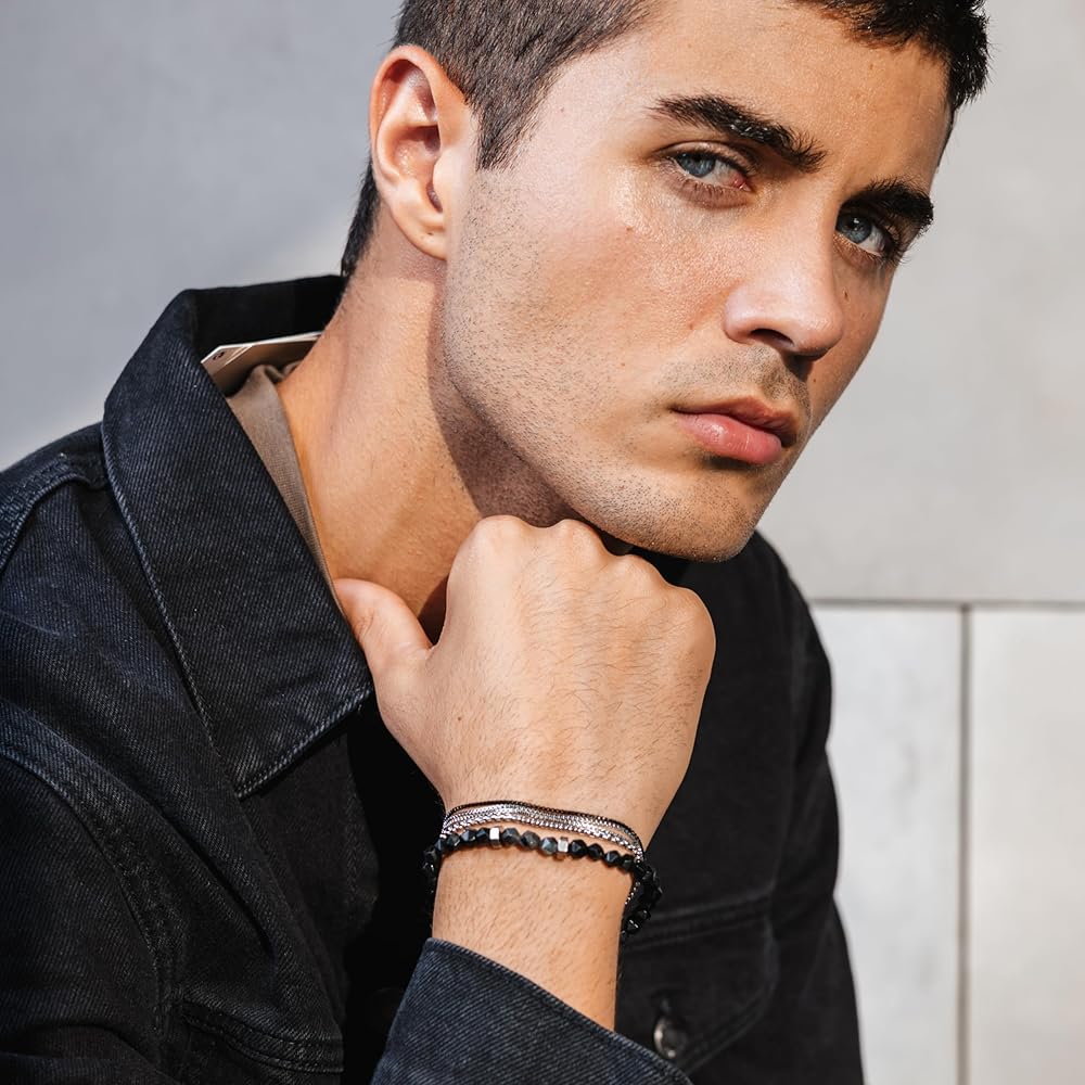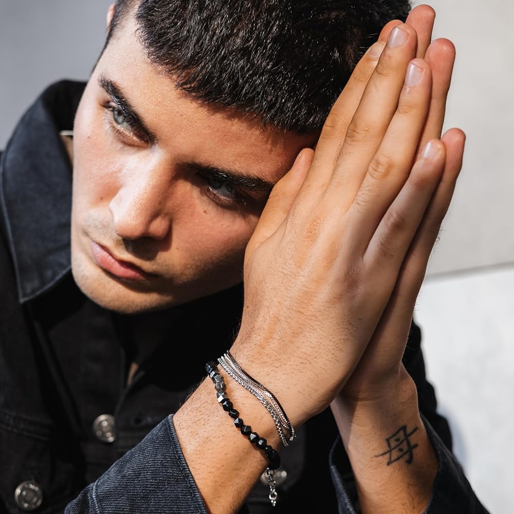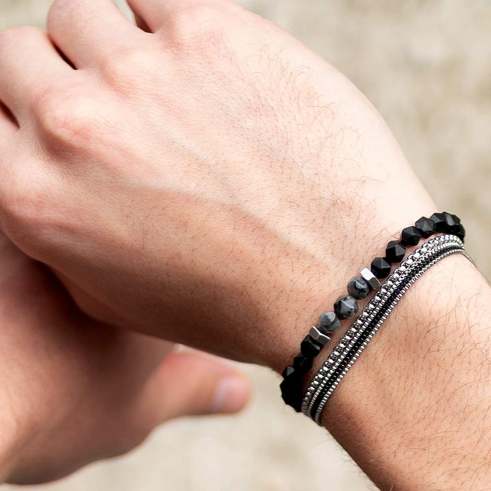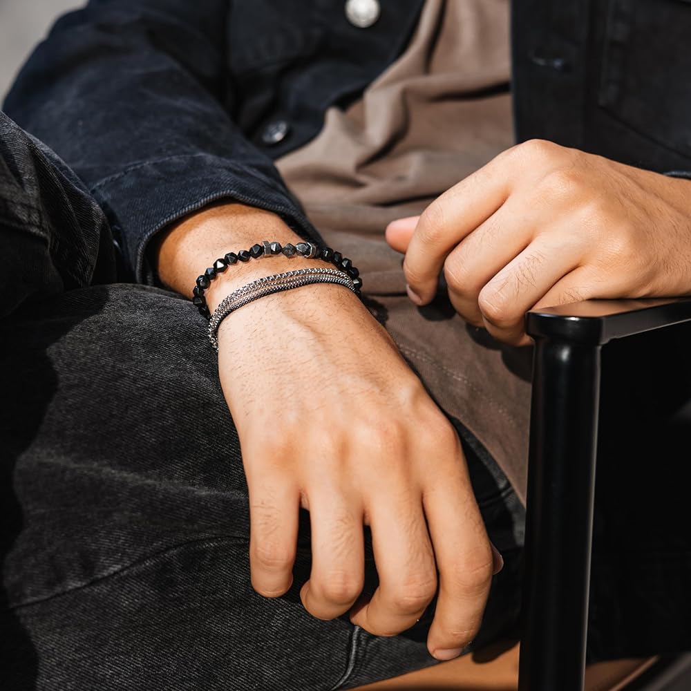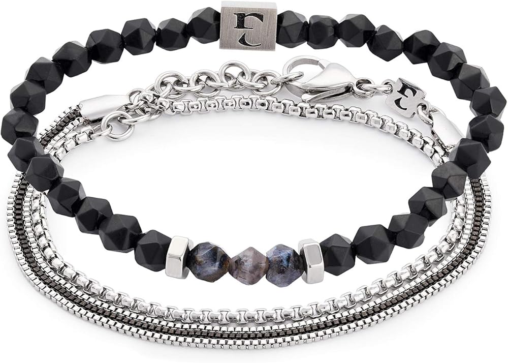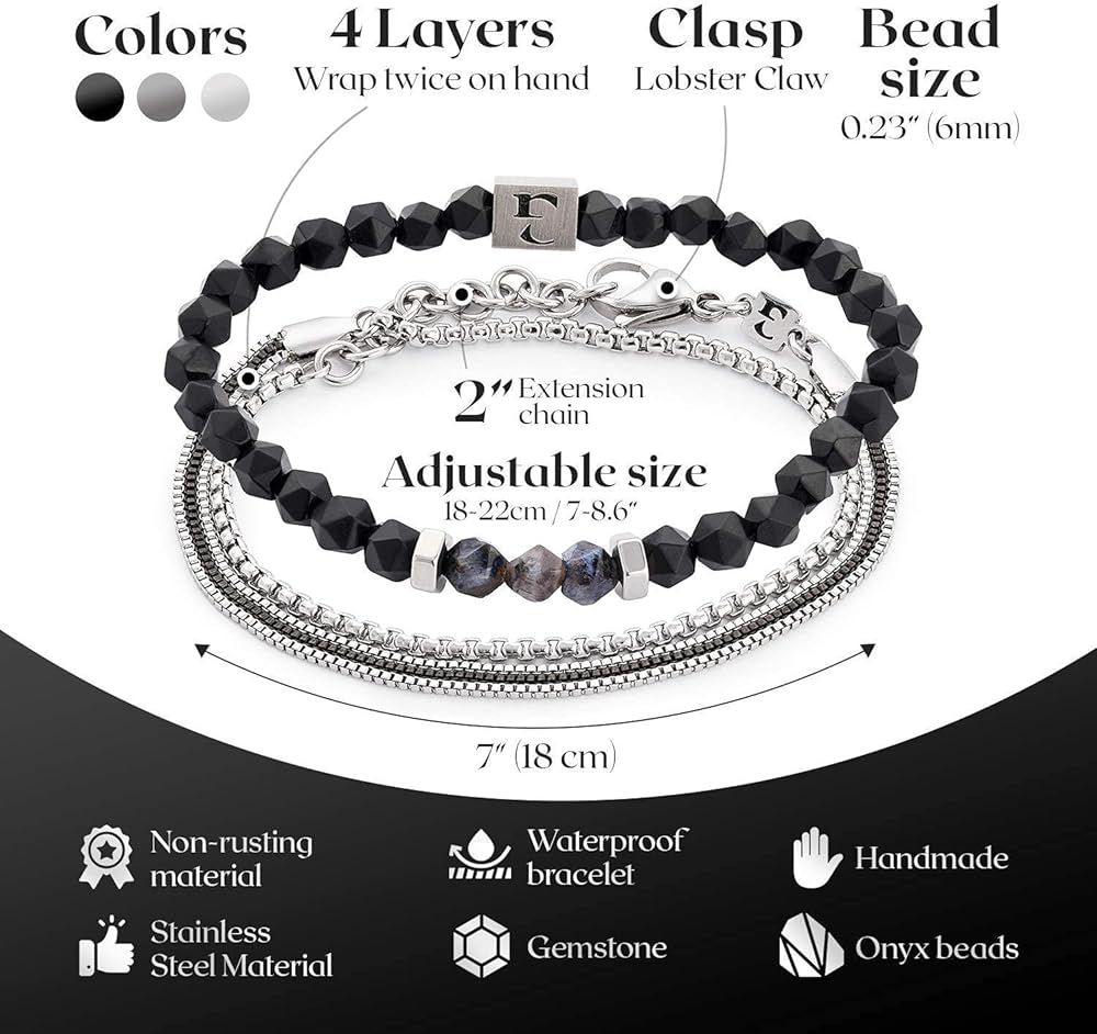 مجموعة أساور Galis - سوار سلسلة صندوقية مكون من 4 طبقات مطلي بالفضة وغير مشوه وسوار من الأحجار الكريمة مع خرز أونيكس أسود، وأحجار كريمة فاخرة وسوار من الفولاذ المقاوم للصدأ مع مشبك مخلب جراد البحر 7 بوصة