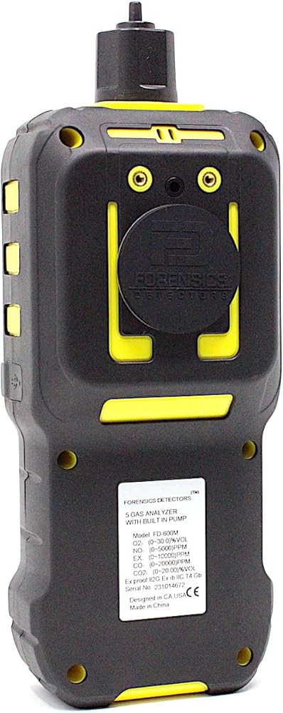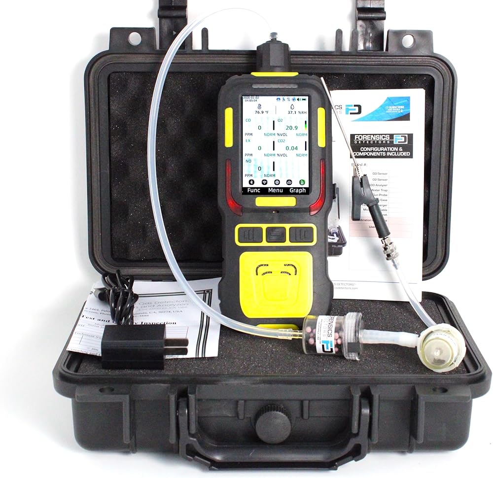 Forensics Detectors presents a high-quality 5-gas analyzer for automotive, motorcycle, forklift, small gas engines, and high-performance combustion tuning and emission testing. The analyzer has a built-in pump and comes with filters and an alligator probe to clip onto the exhaust pipe of the test engine. Made for use with all engine fuels including gasoline, diesel, LPG, propane, butane, natural gas, and all high-performance alternative fuels. The unit is packed with advanced features such as a 32-bit microprocessor, color HD screen, real-time graphing, and data logging functions. The display is massive and shows the levels of the 5 gases along with Temperature and Humidity. A 5-gas analyzer is a crucial tool in automotive diagnostics and emissions testing. It is primarily used to assess the exhaust emissions of internal combustion engines, such as those in cars and trucks. The analyzer measures five key gases in the exhaust stream: carbon monoxide (CO), carbon dioxide (CO2), nitrogen oxides (NOx), oxygen (O2), and hydrocarbons (HC). Analyzing these gases helps technicians evaluate the engine's combustion efficiency, air-fuel mixture, and overall performance. Additionally, it ensures compliance with emission standards and regulations by detecting excessive pollutant levels. This data aids in identifying and addressing issues, reducing environmental impact, and enhancing vehicle fuel economy and safety. Included: Waterproof ABS hard case, 5-Gas Analyzer, niobium magnet for easy mounting, 6-inch stainless steel with alligator probe, hose assembly with 3 feet of high temp silicone tubing, water trap, particle filter, USB charging cable, USB charger, USA NIST traceable calibration certificate, and simple English user manual.