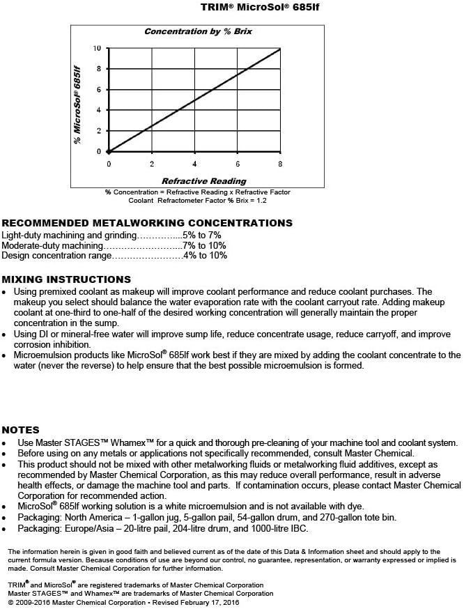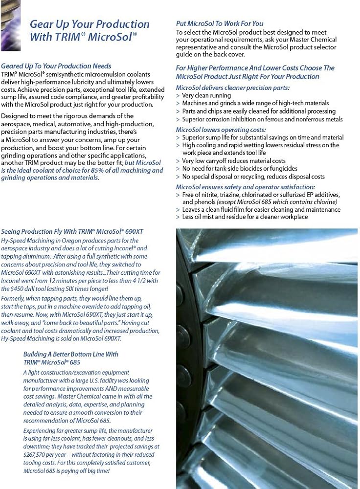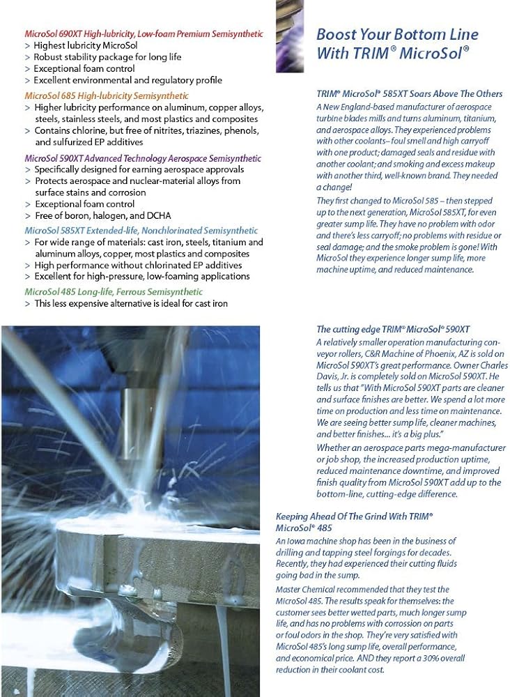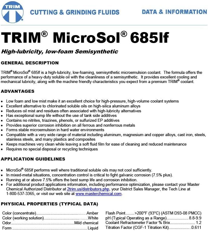 TRIM MicroSol 685lf is a high-lubricity, low-foaming semisynthetic microemulsion coolant. The formula offers the performance of a heavy-duty soluble oil with the cleanliness of a semisynthetic. It provides excellent cooling and mechanical lubricity, along with the machine friendly characteristics you expect from a premium TRIM coolant.