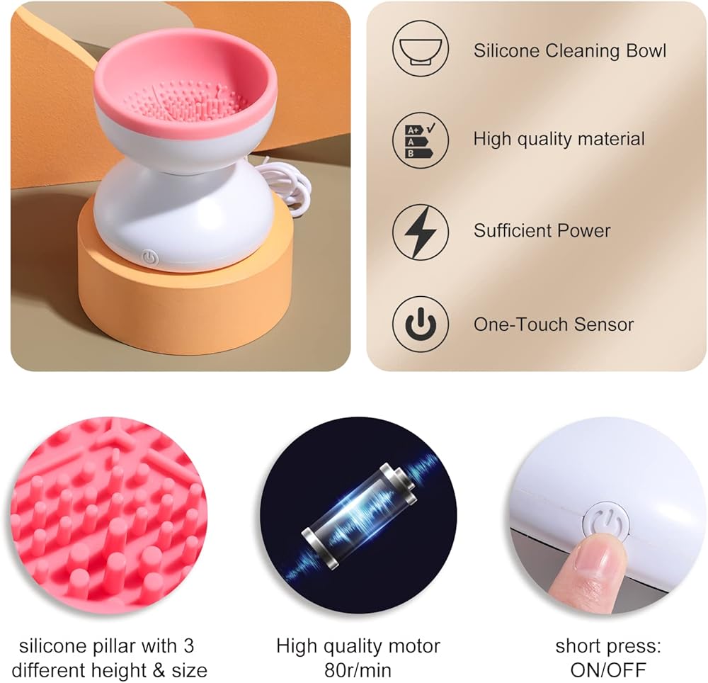 【تعمل بمنفذ USB وسهلة الاستخدام】يمكن لآلة تنظيف فرش المكياج الكهربائية التي تعمل بمنفذ USB تنظيف مجموعة فرش المكياج الخاصة بك مباشرة. لا حاجة إلى تجميع وزر واحد للتنظيف، وهو سهل التشغيل. يتضمن منظف الفرشاة مفتاحًا كهربائيًا مريحًا لسهولة التشغيل البديهي. جميع أجزاء المجموعة مصنوعة بدقة لملاءمة محكمة ومقاومة للتسرب. الوعاء مصنوع من البلاستيك الصحي ولن ينكسر إذا سقط.