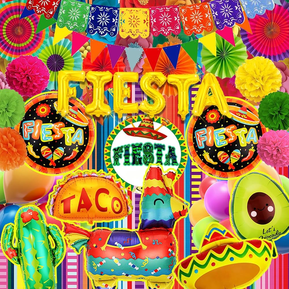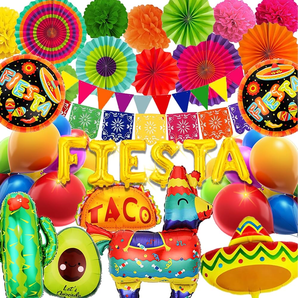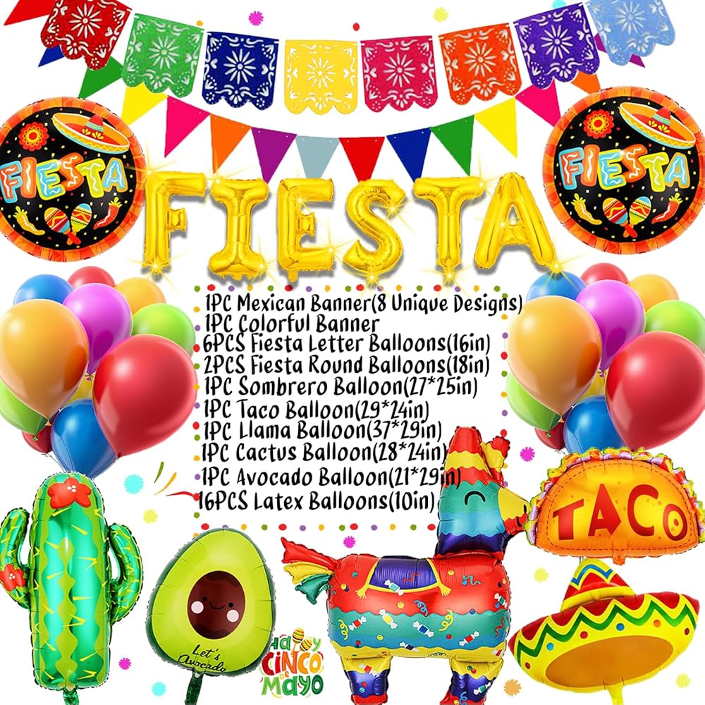 🌮ديكورات الحفلات ذات الطابع المكسيكي - تشتمل لوازم الحفلات لدينا على قطعة واحدة من لافتة بيكادو المكسيكية، قطعة واحدة من لافتة ملونة مكسيكية، قطعة واحدة من بالون لاما، قطعة واحدة من بالونات الأفوكادو، قطعتين من بالونات العيد المستديرة، قطعة واحدة من بالونات سمبريرو، 6 قطع من بالونات حروف العيد، 16 قطعة من بالونات اللاتكس في 8 ألوان، 6 قطع من مراوح الورق، 6 قطع من الكرات الورقية. (تأتي العبوة مع أشرطة وقشات لضخ البالونات).