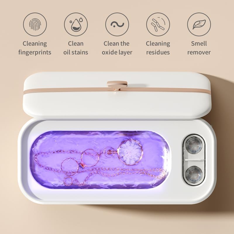 【 Portable size 】 Portable ultrasonic jewelry cleaner, measuring 6.8 L x 2.8 W x 1.5 H inch stainless steel chamber, 12 ounce (350 milliliters) ultrasonic cleaner suitable for deep cleaning of rings, jewelry, glasses, and various accessories from all angles