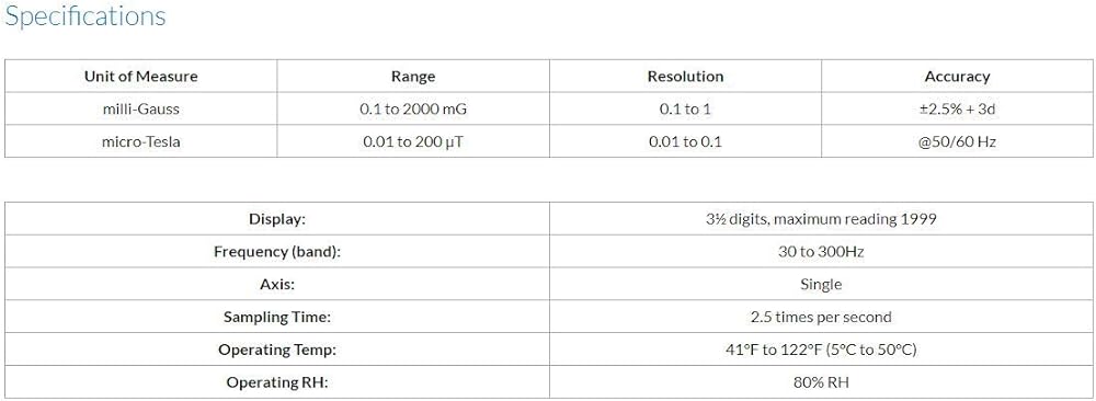 Sper Scientific 840045 EMF Meter Reads milli-Gauss and micro-Tesla on a large 1¼" high display. The EMF Meter's display indicates when the object being measured is out of range as well as when the battery is low. Frequency (band): 30 to 300Hz