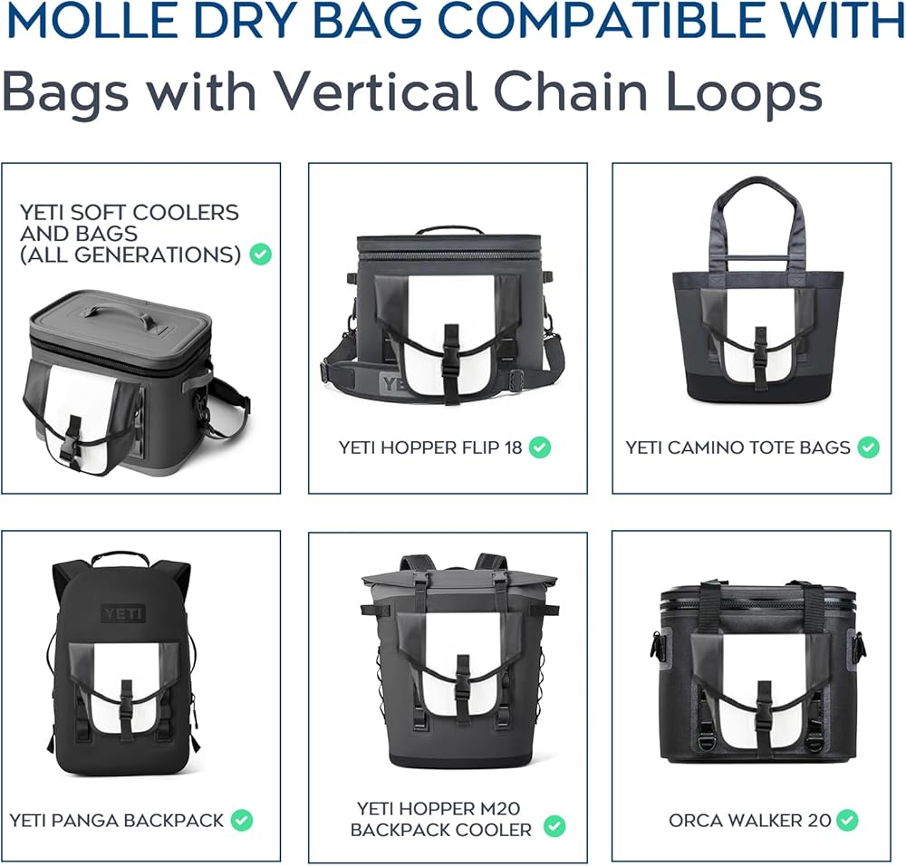 ⭐⭐Our MOLLE dry bag allows for easy attachment of any MOLLE system. It also attaches seamlessly to YETI Soft Coolers, Backpacks, and Totes - including the YETI Hopper Flip 8, 12, and 18, YETI Camino tote bags, the YETI Panga Backpack, the YETI Hopper M20 backpack cooler, the YETI Hopper M12, M15, and M30 soft coolers, the YETI Hopper Backflip 24 cooler, the Orca Walker 20, and the handle of the YETI Tundra Haul Wheeled Cooler. It also works with RTIC items that have hooks.