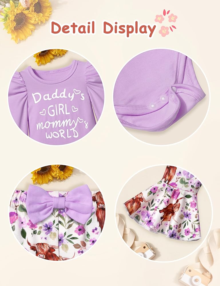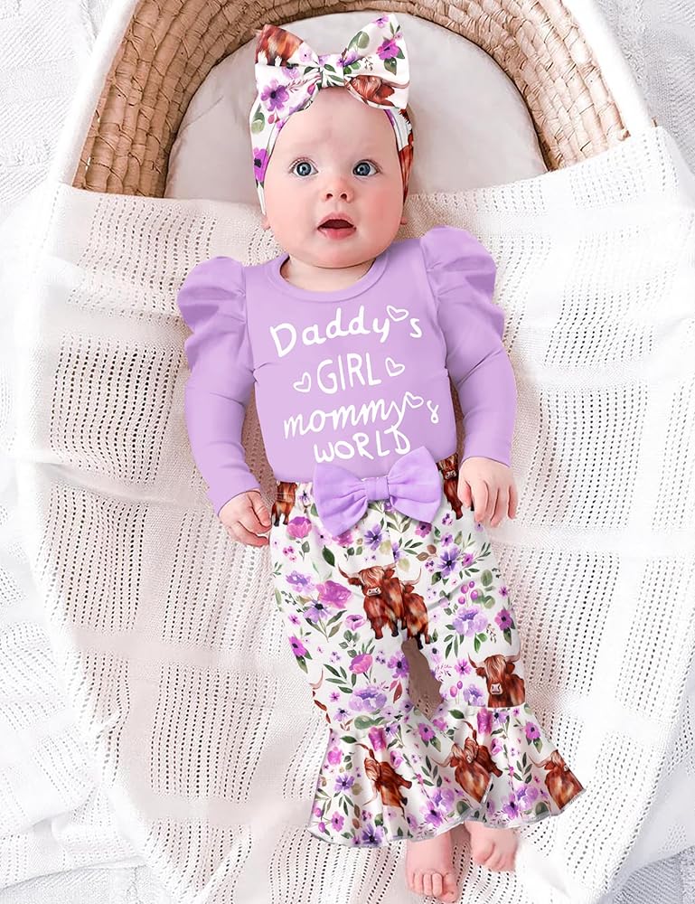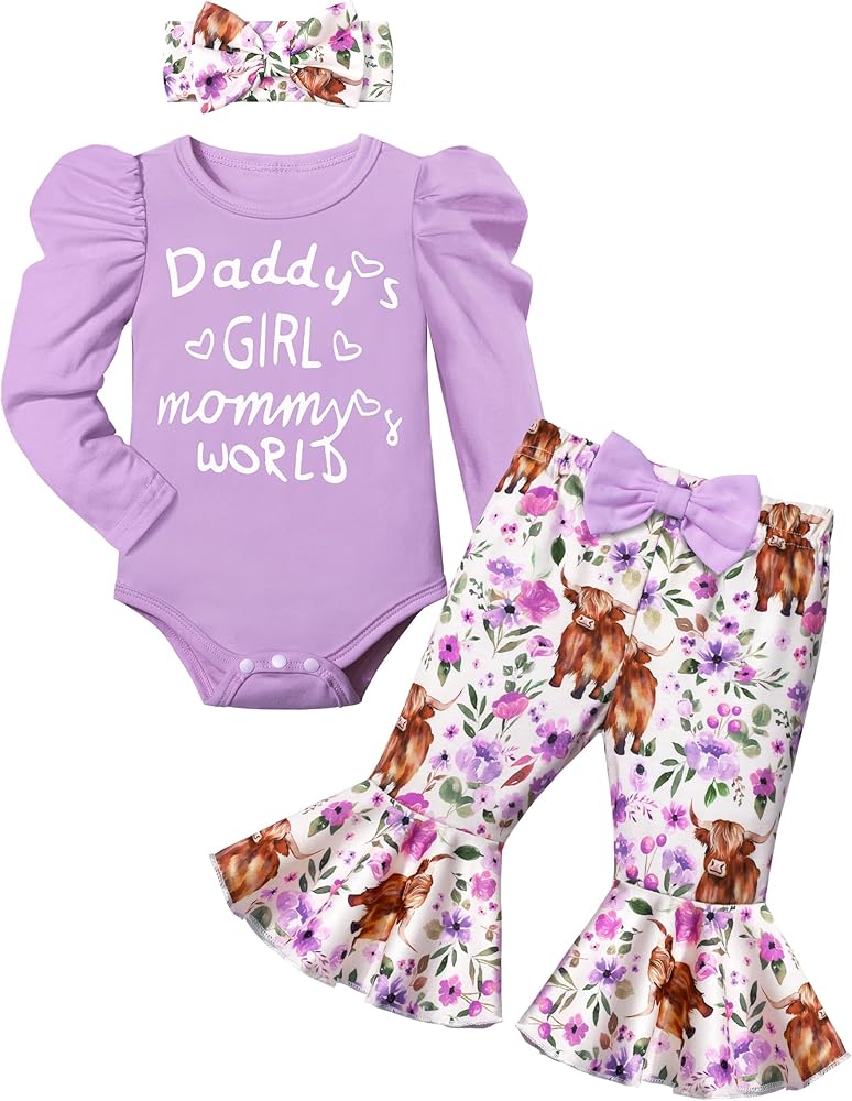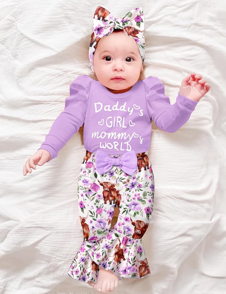 🐂🌷تصميمات أزياء لطيفة: قومي بإلباس أميرتك الصغيرة بمجموعة الملابس الأنيقة والرائعة. مع أكمام منتفخة + رومبر مطبوع عليه حروف "Daddy's GIRL mommy's WORLD"، وطباعة بقرة رائعة وسروال متوهج من الزهور، وعصابة رأس لطيفة، ملابس الأطفال حديثي الولادة لافتة للنظر وعصرية، مما يعزز جمال وسحر أميرتك الصغيرة.