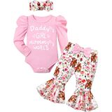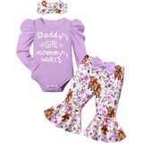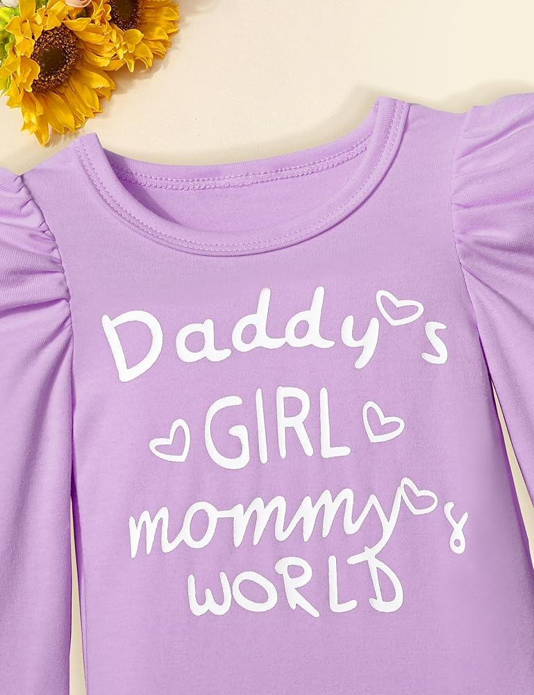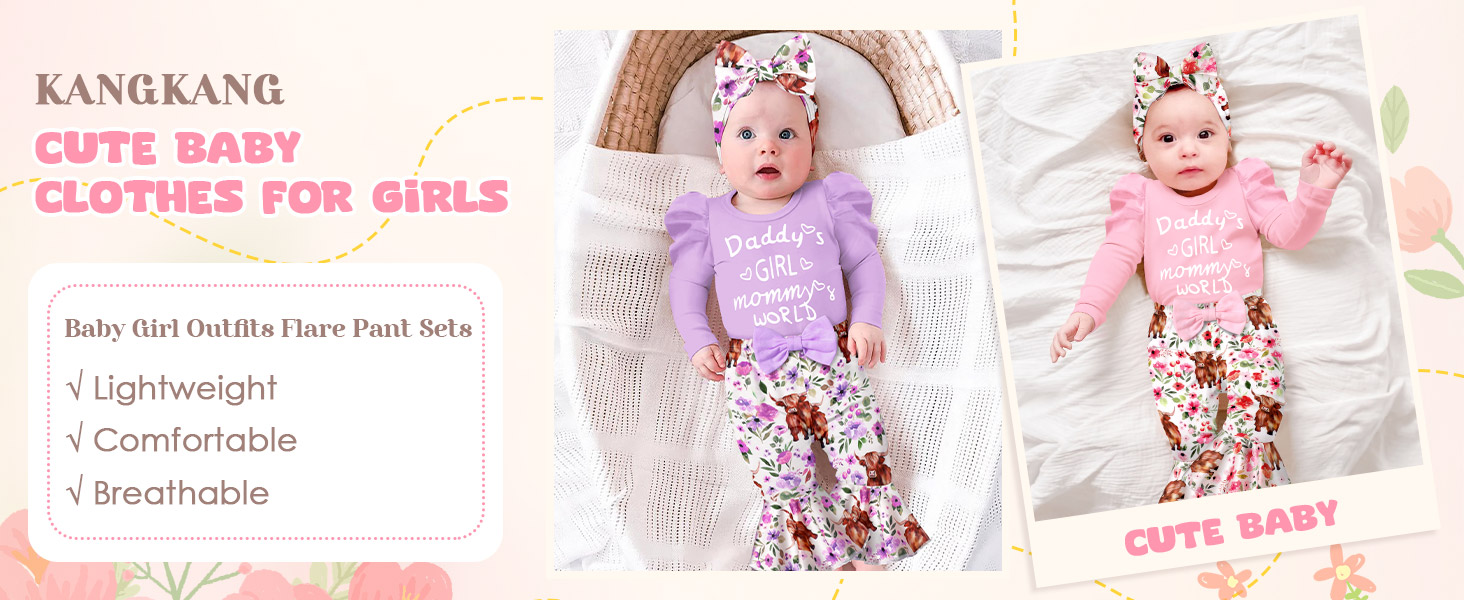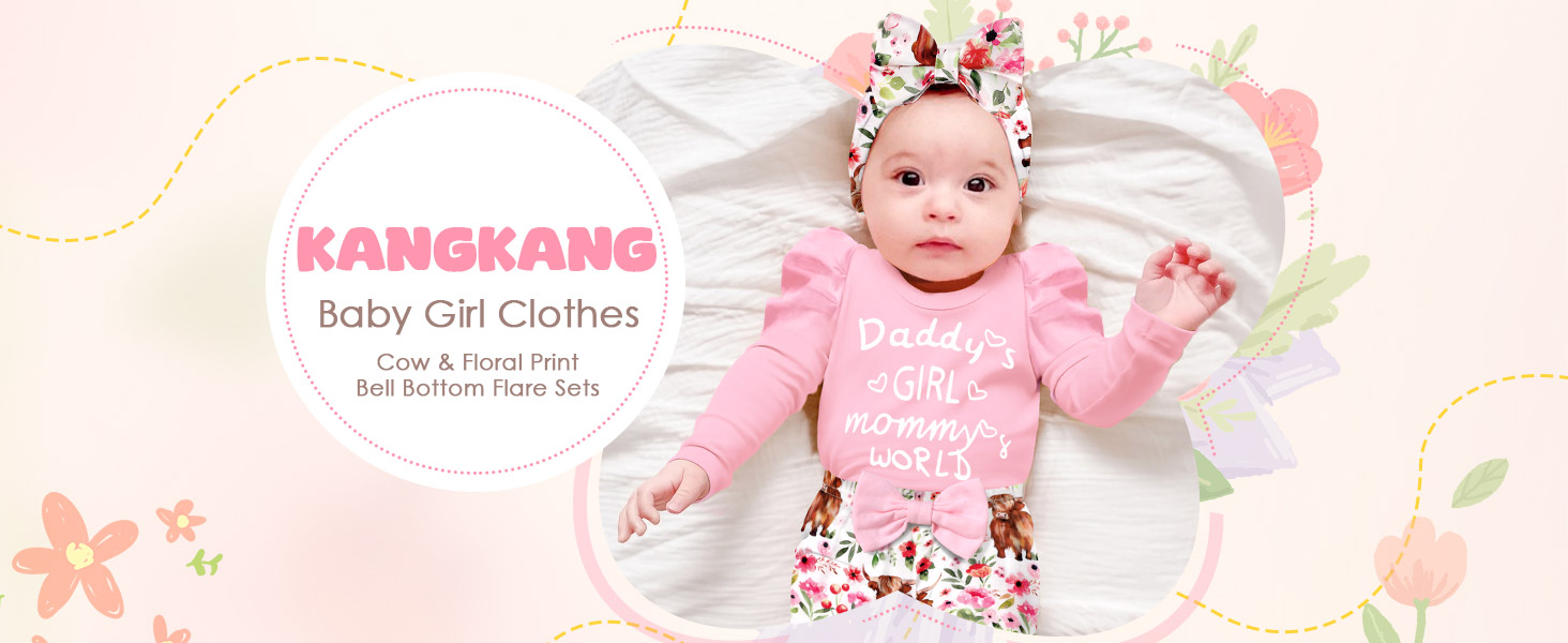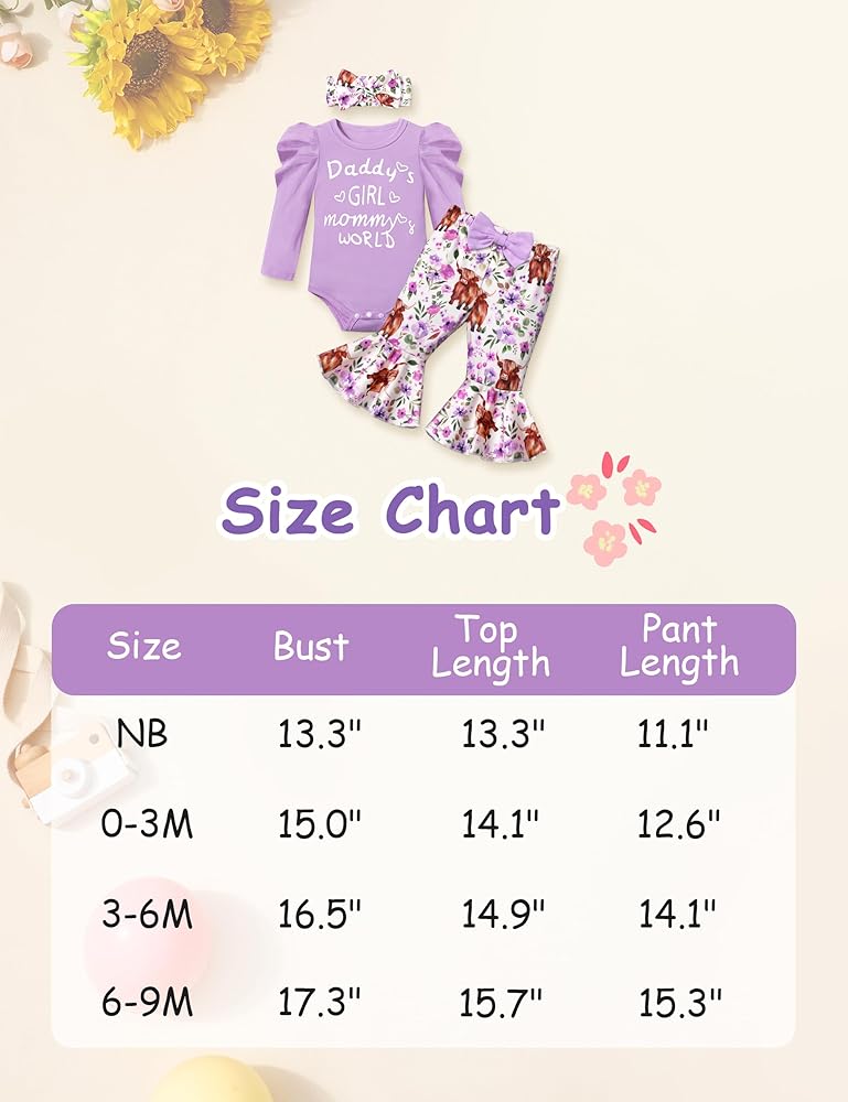 🐂🌷تصميمات أزياء لطيفة: قومي بإلباس أميرتك الصغيرة بمجموعة الملابس الأنيقة والرائعة. مع أكمام منتفخة + رومبر مطبوع عليه حروف "Daddy's GIRL mommy's WORLD"، وطباعة بقرة رائعة وسروال متوهج من الزهور، وعصابة رأس لطيفة، ملابس الأطفال حديثي الولادة لافتة للنظر وعصرية، مما يعزز جمال وسحر أميرتك الصغيرة.