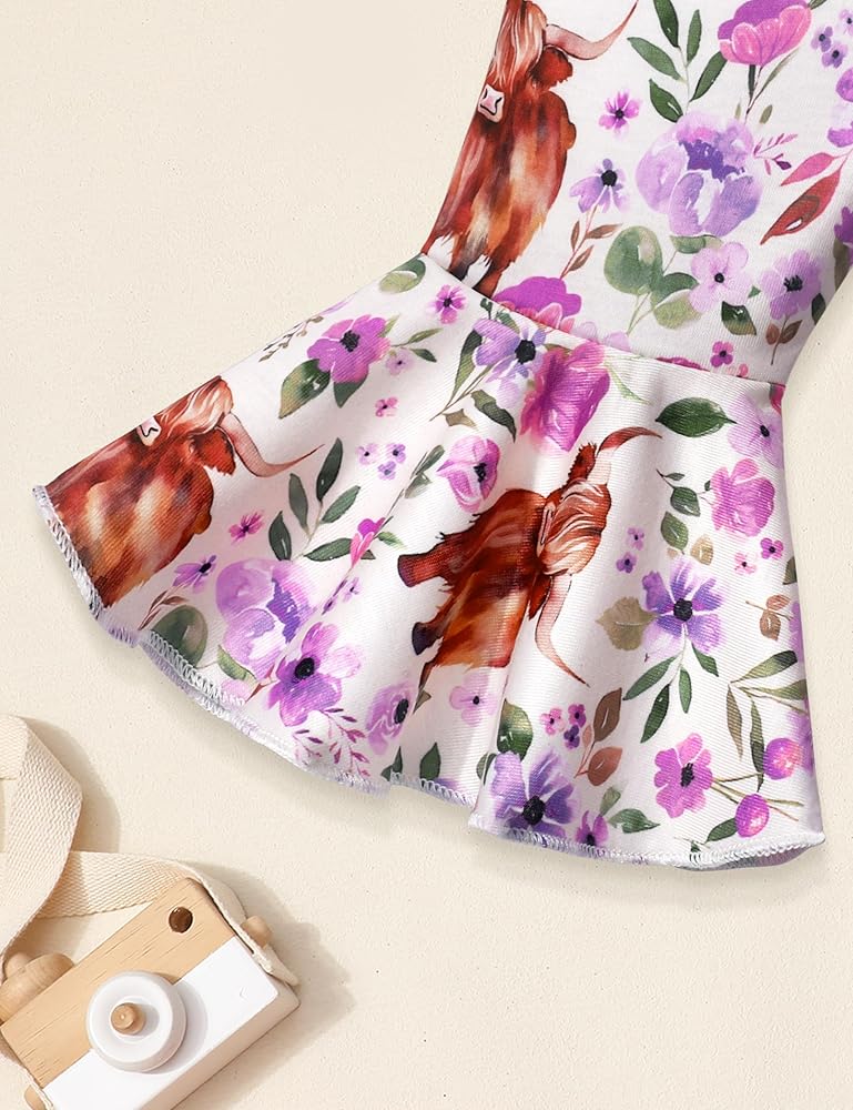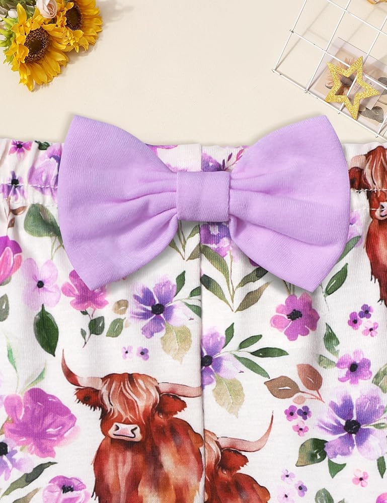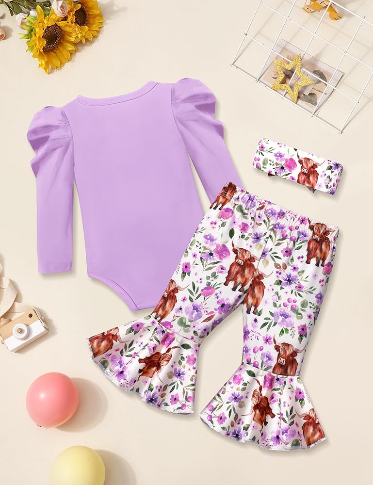 🐂🌷أفضل هدية للطفل: 3 قطع ملابس للفتيات الصغيرات، هدية رائعة لابنتك وحفيدتك وابنة أختك. تشمل العبوة: 1x قميص رومبر بأكمام منتفخة + 1x بنطال واسع بنقشة زهور البقرة + 1x عصابة رأس لطيفة.