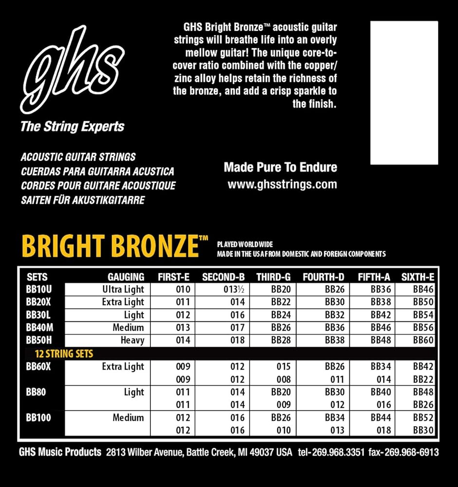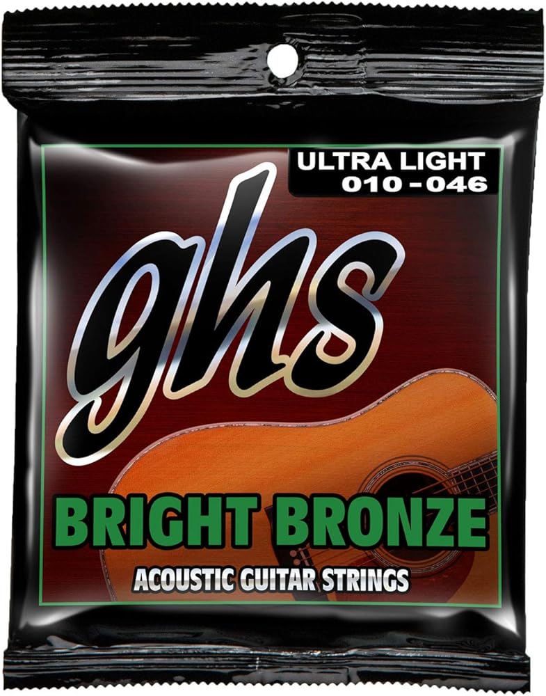 GHS Bright Bronze acoustic guitar strings boast a specially tempered 80/20 copper-zinc alloy wound over a hex core to deliver an extra-bright tone. This expertly designed core-to-cover ratio gives increased brightness & flexibility.