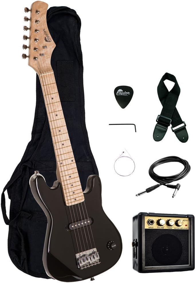 Everyone has to start somewhere and the Raptor ep3 pack is your child's ticket to rock stardom the ep3 measures 30" in length and is constructed of light weight solid basswood body, making it fit well in your kid's hands. It's equipped with a single coil pick up and a fixed bridge for awesome rock tones and vibes. Pack comes complete with an amp and accessories.