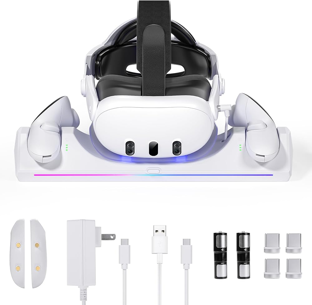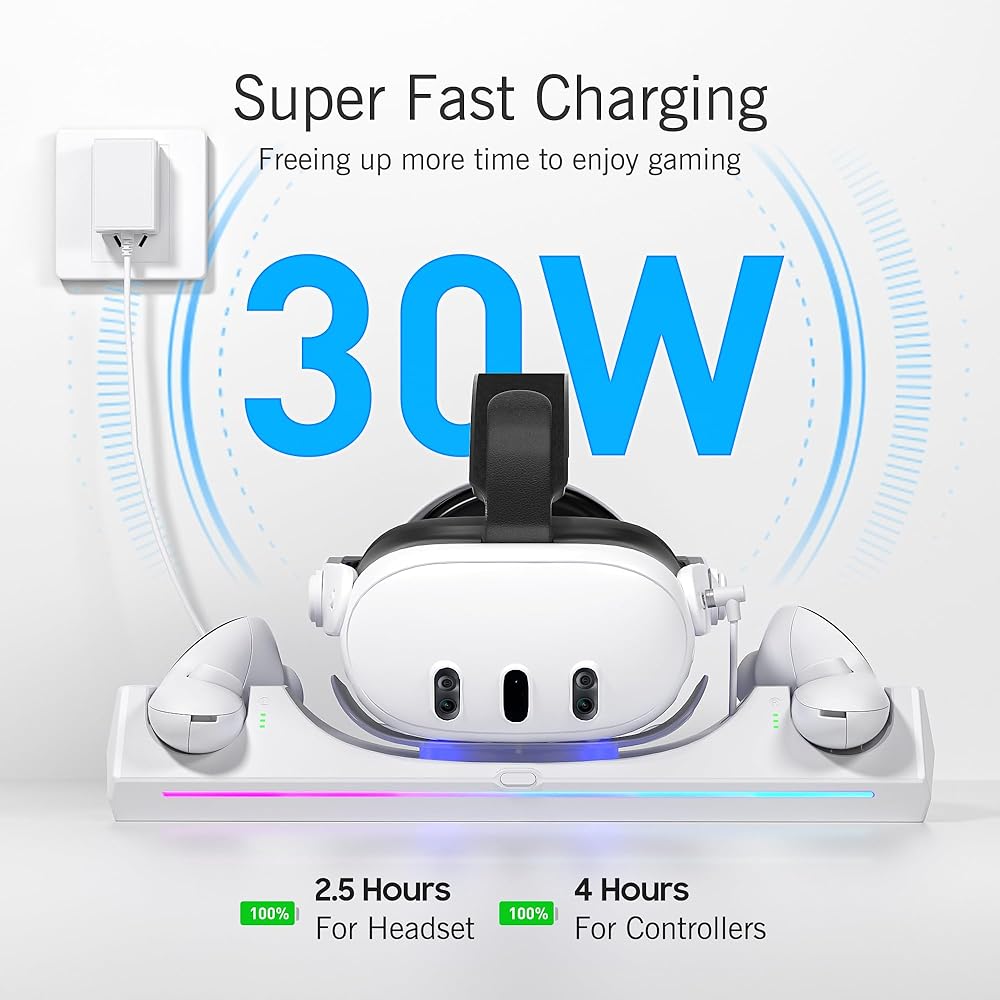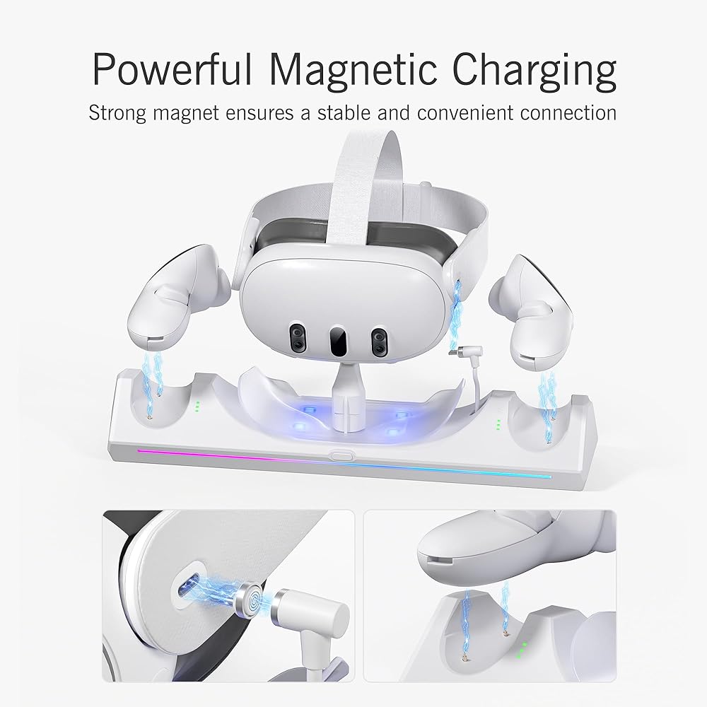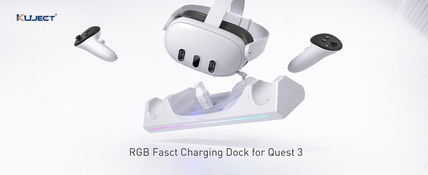 قاعدة شحن Kuject RGB لـ Quest 3، محطة شحن سريعة 30 وات مع مؤشر LED لسماعات الرأس وأجهزة التحكم في الواقع الافتراضي، وملحقات حامل شحن مغناطيسي مع بطاريات قابلة لإعادة الشحن وشاحن USB-C