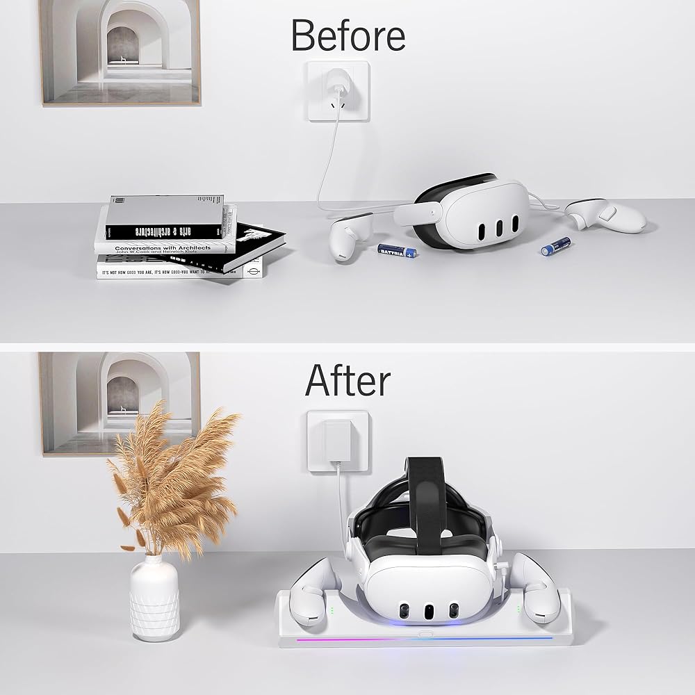 【إضاءة محيطة RGB 】 مصممة خصيصًا لـ Quest 3، تتميز قاعدة الشحن هذه بإضاءة محيطة RGB متدرجة، مما يضيف جمالية تشبه الحلم ومتقنة للتكنولوجيا لكل من الشحن والعرض. عندما يحين وقت النوم الهادئ ليلاً، قم بإيقاف تشغيل ضوء التنفس بسهولة، ويدخل الرصيف في وضع السكون، ويشحن Quest 3 بصمت. كل لحظة مع Quest 3 مليئة بالتكنولوجيا والبهجة البصرية.