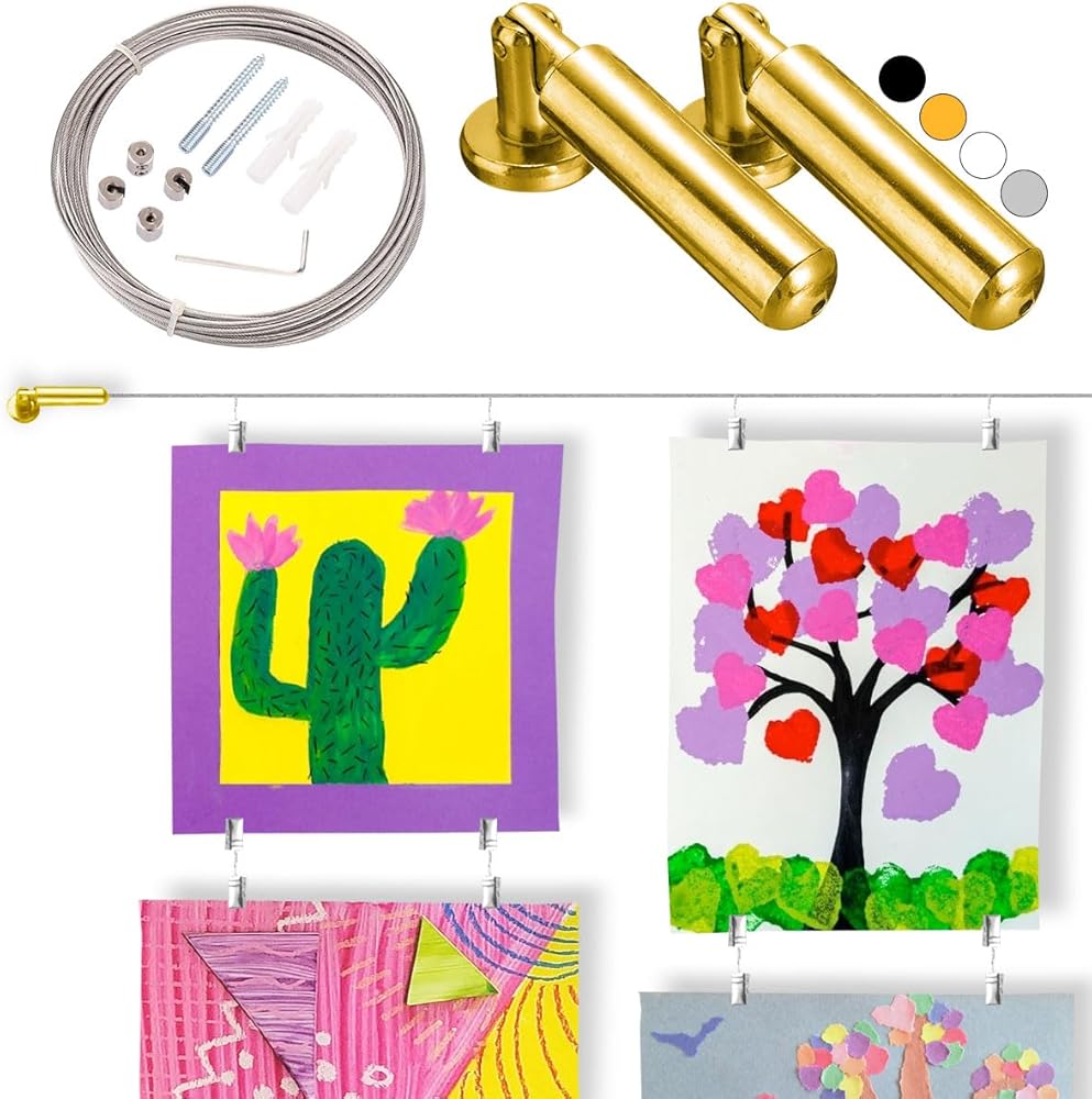 Display Your Kiddos Art Work in Style. Receive: Wire Hanging Kit + 40 Clips. Cable line measures 16.5 ft (198 inches). All hardware included. Instructions also included in package. This will need to be mounted onto the wall-- so grab someone handy to do it! Please contact us with any questions, we're here to help! Family owned company. Versatile Hanging Solution: Our innovative hanging kids artwork display string offers a versatile way to showcase your child's creativity. Whether it's paintings, drawings, photos, photo, classroom art display or crafts, this wire artwork display allows you to effortlessly rotate and display their ever-evolving masterpieces. Sleek and Minimalist Design: Elevate your kids' artwork display for the wall with our sleek and minimalist kid art display wire. It seamlessly blends into any decor, adding a touch of sophistication while putting the focus squarely on the colorful and imaginative artwork. Easy-to-Use Picture Hanging Wire with Clips: Transform your wall into a captivating gallery with our hassle-free kid artwork display wire. Designed for parents and children alike, this curtain wire art hanging system makes it easy to clip, change, and update the displayed art, fostering a sense of pride and accomplishment for your little artists. This wire to hang kids artwork / wire rod kit comes with instructions. Customizable and Interactive: Foster your child's love for art with our interactive kids art display with clips. This unique artwork hanger for kids allows them to actively participate in curating their own gallery, building their confidence and making them an integral part of their own creative journey.