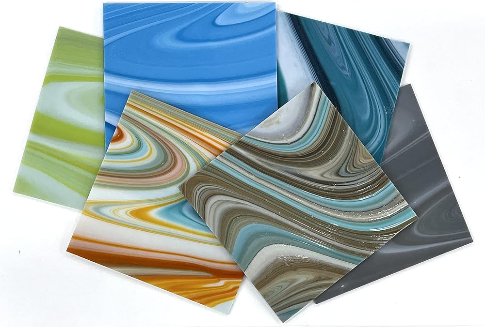 Oceanside Spectrum Fusers Reserve COE96 Assorted Glass 6Pack. The allure of this glass lies in how the molten colors reacted with one another during production. Fusers Reserve glass are as intriguing as they are varied, every sheet is unique. This selection Includes six, 4 inch by 4 inch Oceanside - Spectrum Fuser's Reserve COE96 fusible glass.