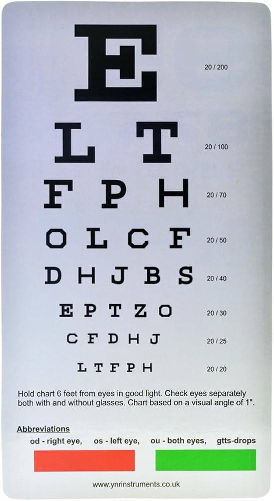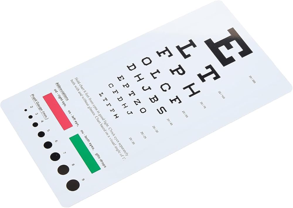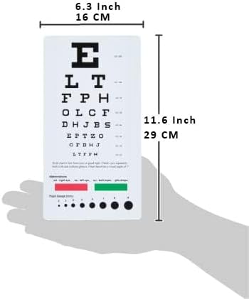 Snellen wall eye chart is the familiar chart with the big letter or symbol at the top and progressively smaller letters at the bottom of the chart down to 20/20 or better. The eye chart assists in measuring visual acuity at a distance of 20 feet away from the viewer. The Snellen chart includes Red and Green color bars for an easy and helpful color vision test. Snellen eye chart Made of Plastic and washable. Perfect for optometrists, students, offices, and schools.
