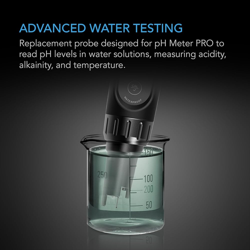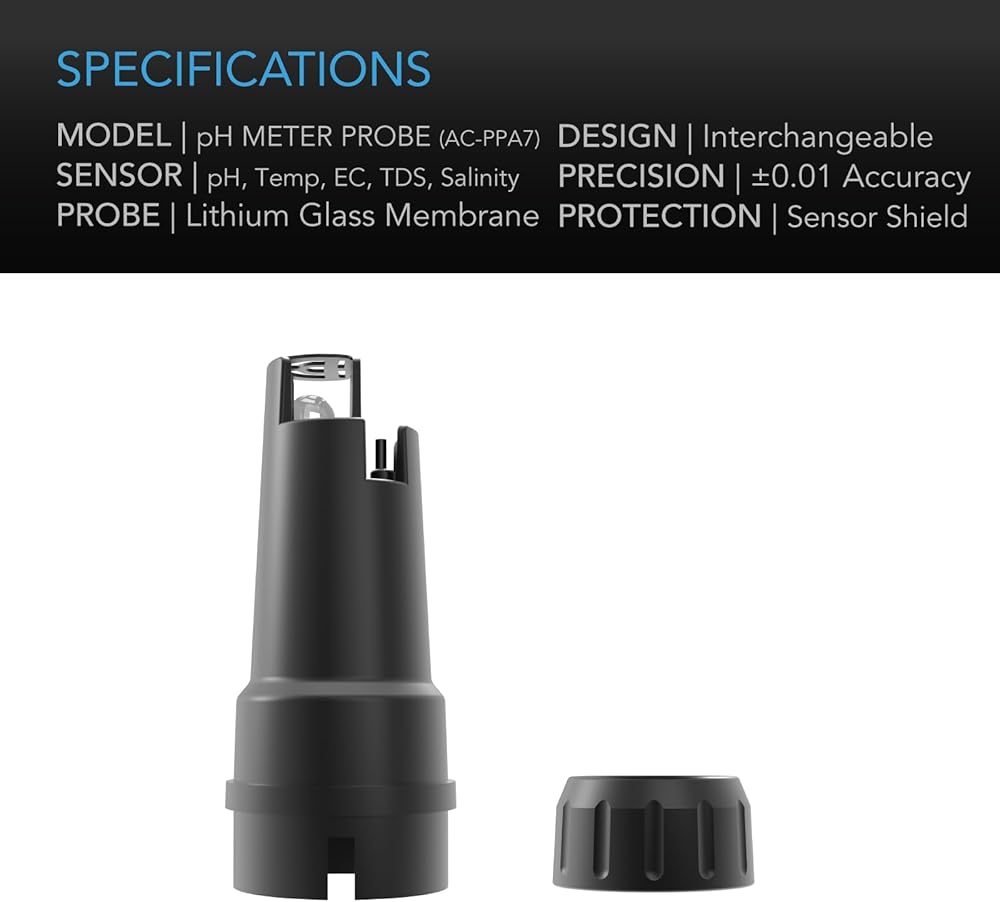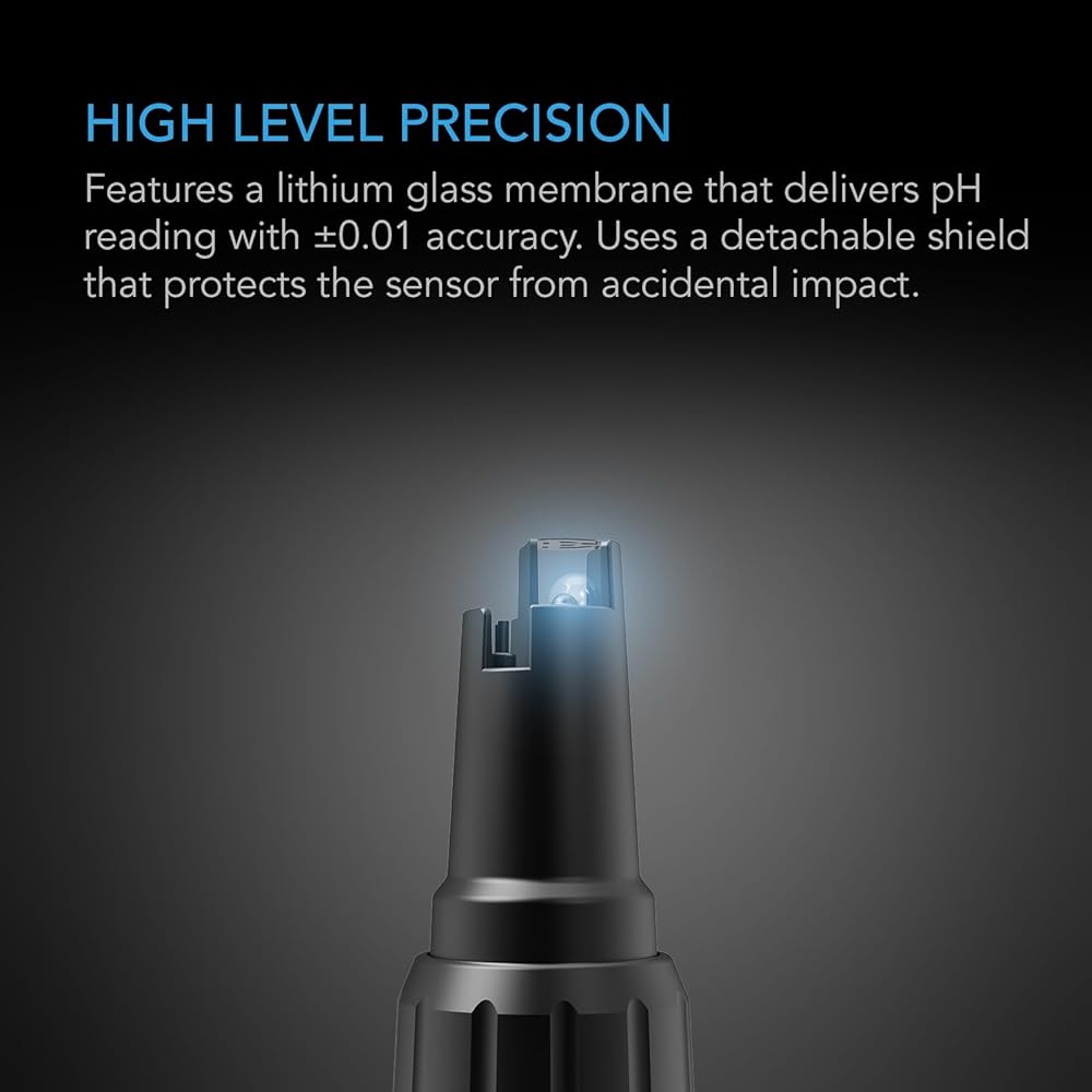 A digital hydroponic testing meter for measuring water's acidity, alkalinity, electrical conductivity (EC), total dissolved solids (TDS), temperature, and salinity (salt content) to help optimize its quality for gardening and water treatment applications. The highly responsive sensor probe utilizes a lithium glass membrane to instantly determine pH readings with highly precise ±0.01 accuracy. This all-in-one pH pen tester for water features an IP-67 rating, specially sealed to withstand moisture and heat, as well as block out intrusive dust and sand. For further protection, the hydroponic pH meter is built with a sensor shield to safeguard your probe in between uses. The included 4.00 pH, 7.00 pH, 12.88 mS, and 1413 µS calibration solutions ensure consistently accurate measurements, while the 3M KCL solution supports proper storage conditions to help extend the lifespan of the pH and PPM meter.