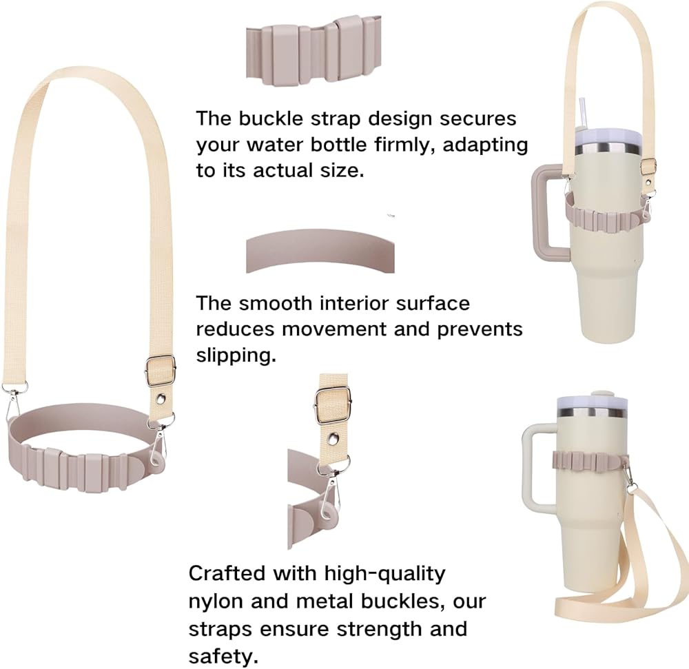 Versatile Fit: The water bottle handle strap accommodates a wide range of sizes, stretching to fit 8-40 oz water bottles, sippy cups, travel mugs, and more. The adjustable nylon strap allows customization for comfortable shoulder or crossbody carrying, preventing the bottle from sliding and ensuring a secure fit.