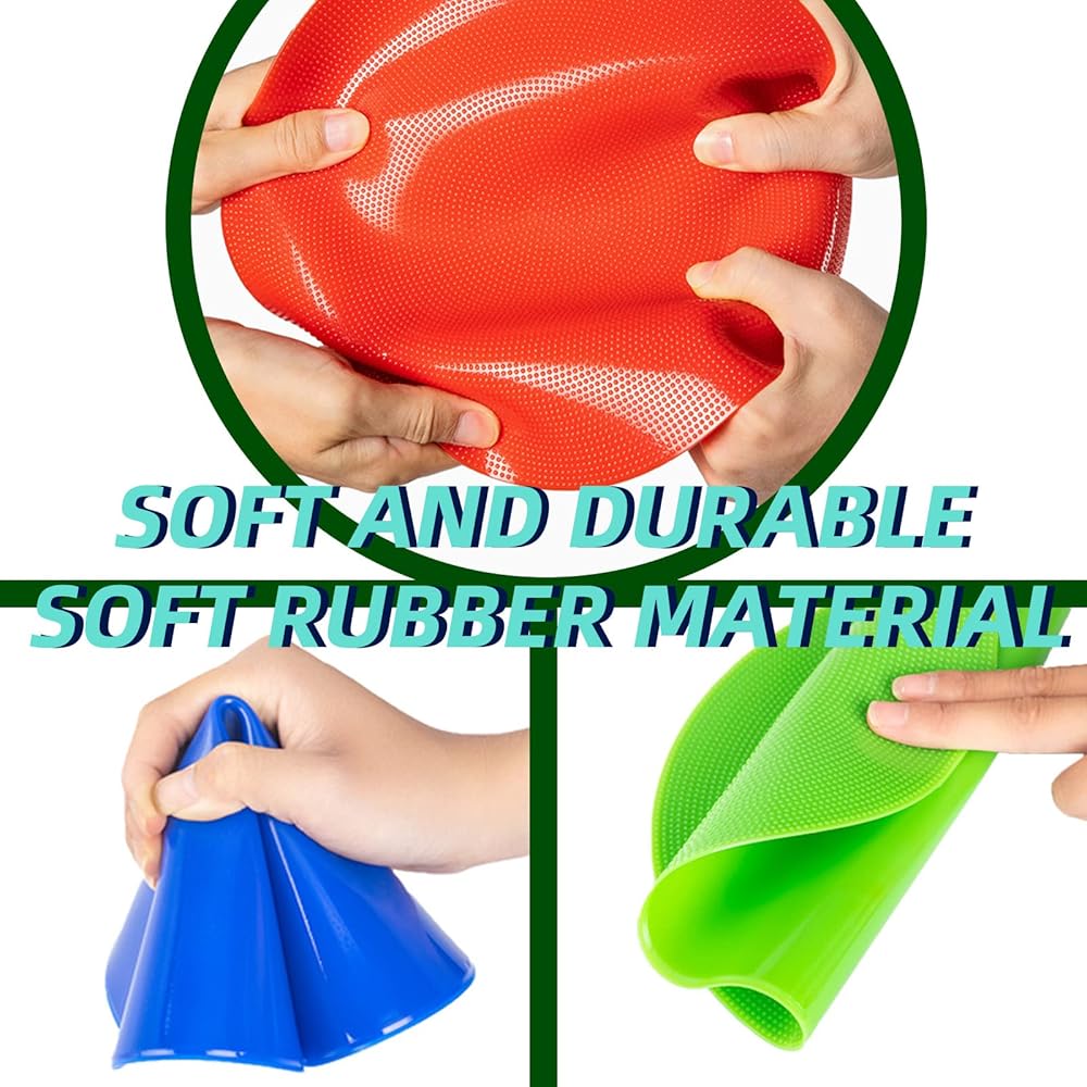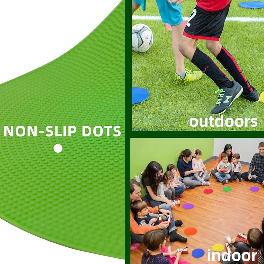 NON-SLIP RUBBER: They resist sliding across gym floors or pavement when stepped on or run over during activities, making them safe for use during fast-paced games and drills.Includes 2 sets of the 9 spectrum colors: red, orange, yellow, green, blue, purple.