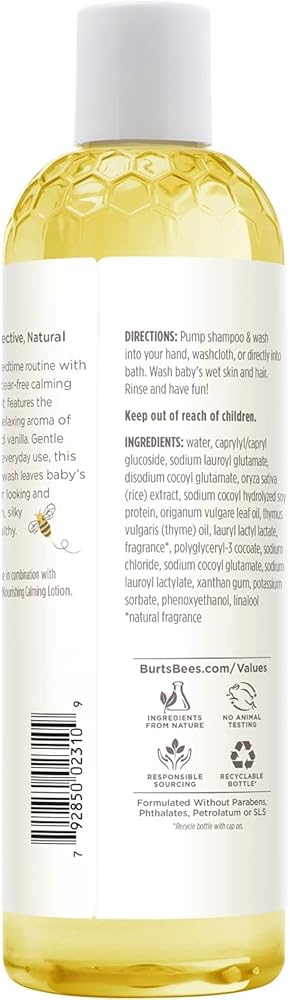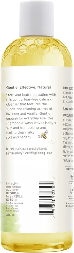 Burt's Bees Baby Bee Shampoo & Wash - Calming is made with natural moisturizers and the soothing scents of aromatic lavender and vanilla to gently cleanse and calm your baby before bedtime. leave your baby's skin silky, soft and super smooth. This tear free formula is 98.9% natural and helps relax mama and baby while it cleanses. Clinically shown to be gentle enough for everyday baby care and its pediatrician-tested. Plus, it contains no parabens or phthalates. Nurture baby's skin naturally with Baby Bee from Burt's Bees.
