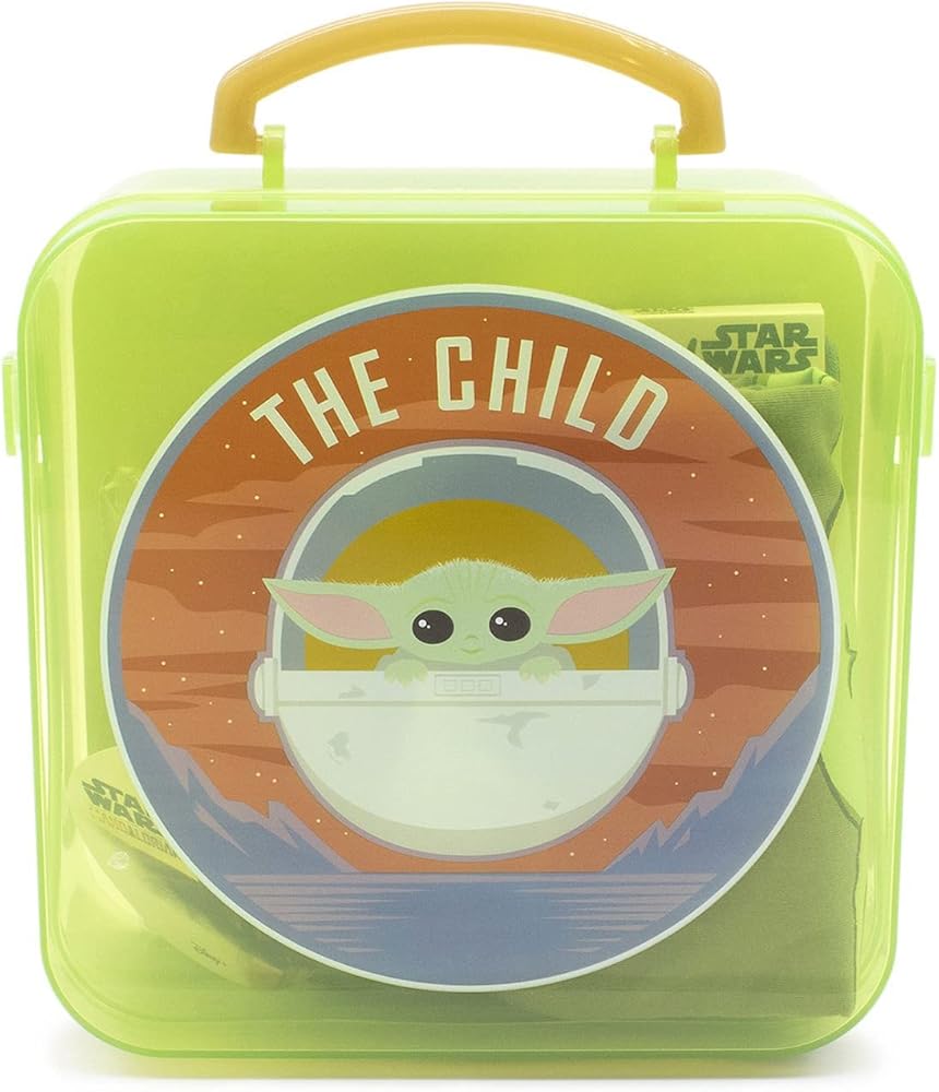 Officially Licensed Star Wars gift set for kids! Star Wars is one of the most popular film sagas ever! Ever Since Disney Plus released The Mandalorian, Grogu aka The Child, aka Baby Yoda has made everyone fall in love with him. This Baby Yoda 5 piece gift set has some cool things for kids like a great Baby Yoda t-shirt, Baby Yoda crew socks, a Jumbi Baby Yoda sticker, a Tri-fold wallet, and a three-piece magnet set. To top it off, it all comes in a collectible hard plastic case that can be used to tote around action figures and toys or anything else. The case has an easy carry top handle and snaps closure. The shirt is a soft 60% cotton/40% polyester fabric. The crew socks are 98% polyester/2% spandex.