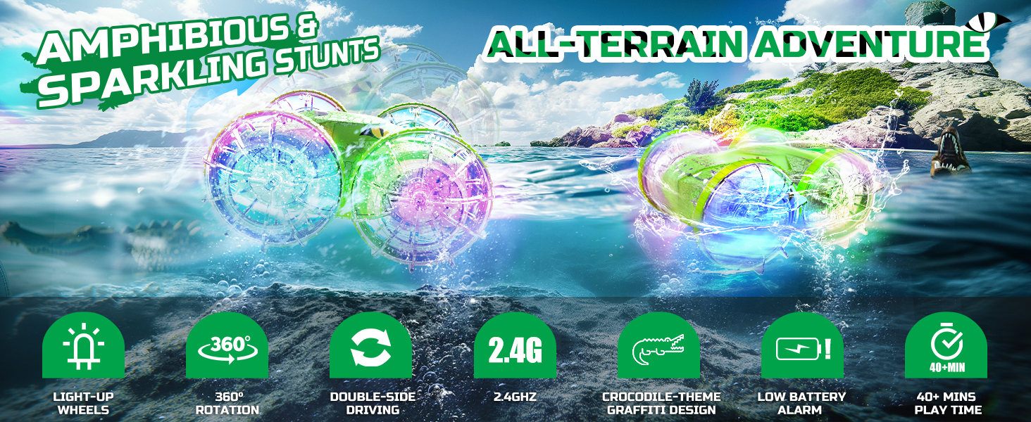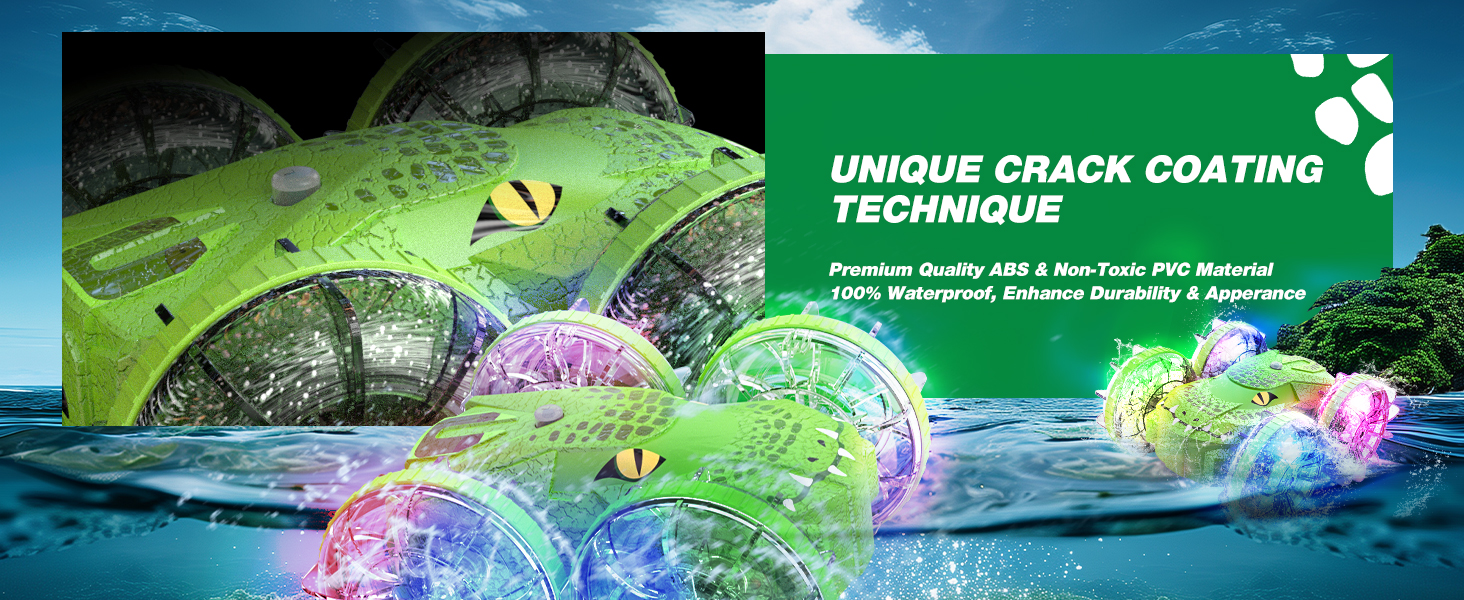 • 【سيارة تمساح برمائية تعمل بالتحكم عن بعد】: يمكن لسيارة RC المطورة المقاومة للماء بنسبة 100% أن تتسابق بسهولة في جميع التضاريس. لعبة مقاومة للماء تضمن الحماية من أضرار المياه. سواء كنت تقود السيارة على الأرض أو تبحر في الماء، فسوف تستمتع بالتحكم السلس والمتعة التي لا نهاية لها. بالإضافة إلى ذلك، فإن رسومات التمساح المصممة خصيصًا بتقنية طلاء الشقوق لا تجعلها تبدو رائعة فحسب، بل تعزز أيضًا متانتها!