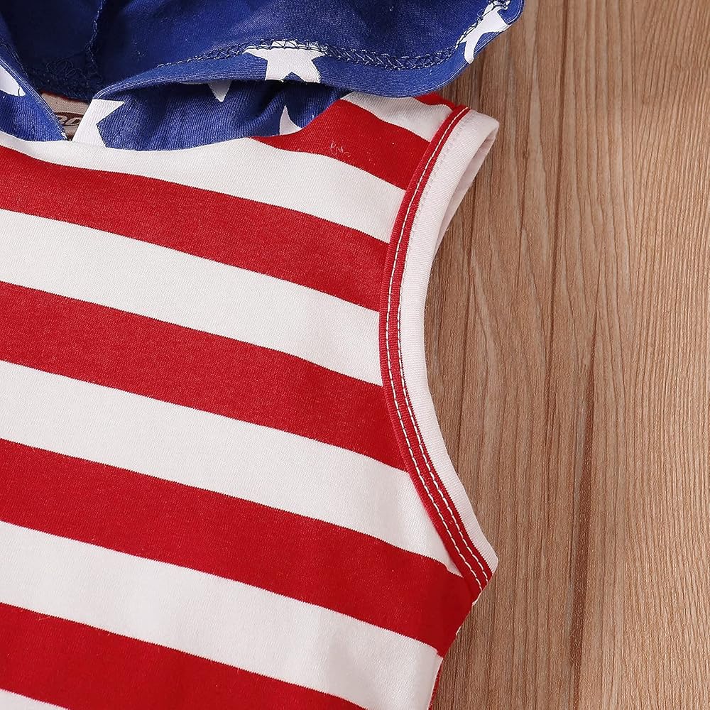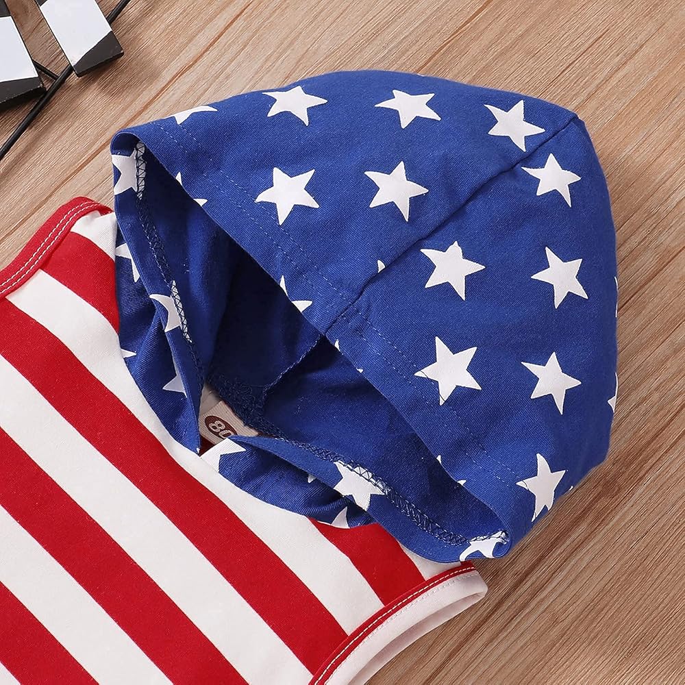 التصميم: تي شيرت بقلنسوة بدون أكمام برقبة دائرية، نمط العلم الأمريكي الأنيق، قميص علوي مطبوع عليه خطوط حمراء وبيضاء وسروال قصير مطبوع عليه نجوم، أكثر احتفالية بيوم الاستقلال.