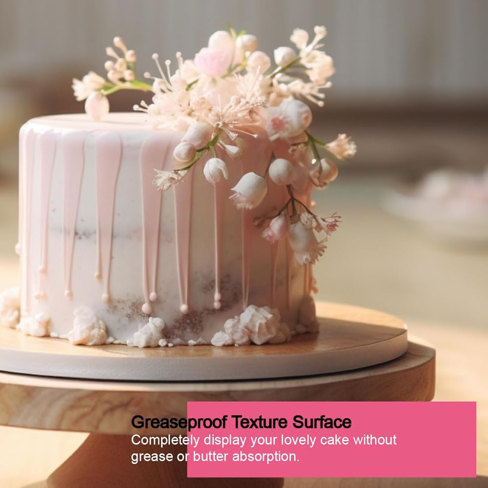 ★سطح مقاوم للدهون. ألواح الكعك مغطاة بسطح نسيجي من الأعلى والحافة، وهي مقاومة للماء والشحوم، وسهلة المسح إذا حصلت على كريمة زبدة زائدة على اللوحة. يساعد الملمس أيضًا على إبقاء طبولتك في مكانها على القرص الدوار للكعك أو حتى إذا كنت تضيف طبول الكعك إلى لوحة أخرى أو دعامة/حامل للكيك!