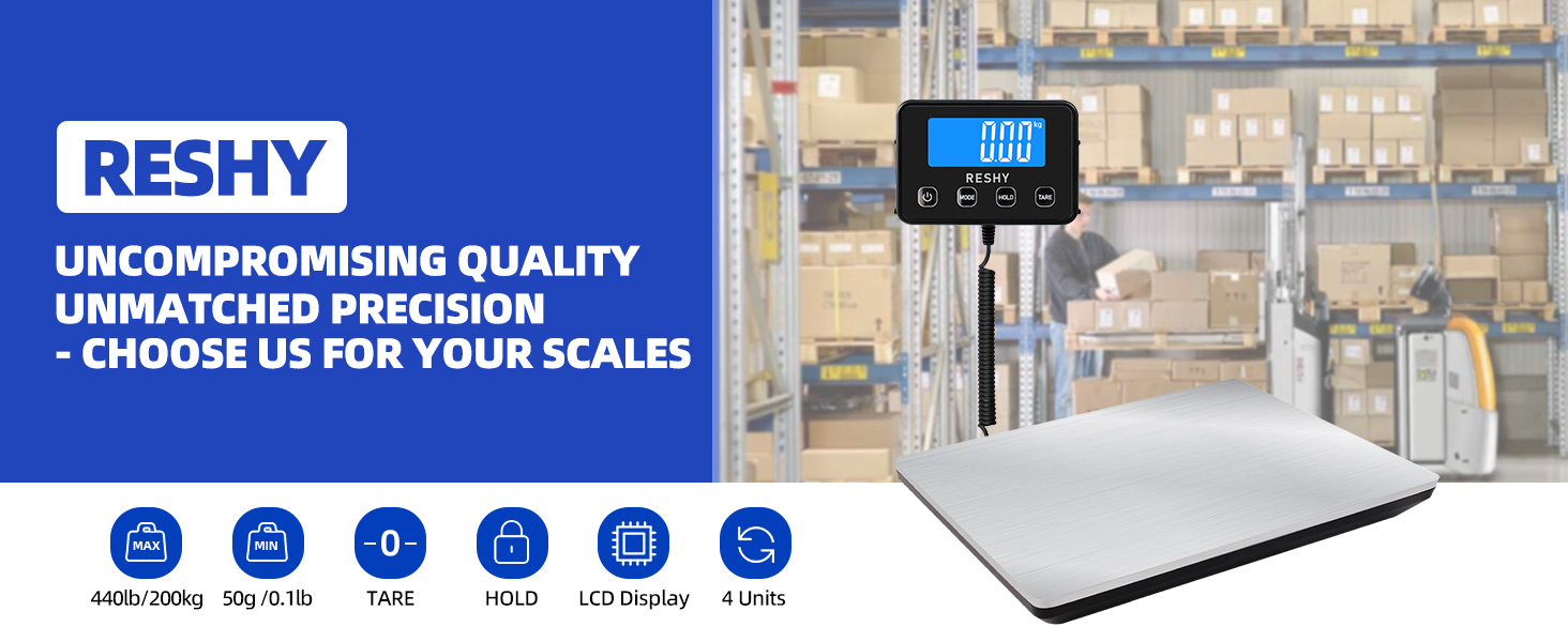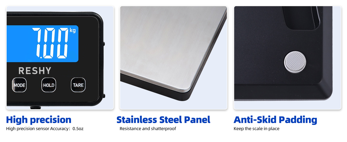 • بناء قوي: مصنوع من الفولاذ المقاوم للصدأ القوي، تم تصميم مقياس الشحن الرقمي RESHY لتحمل قسوة الاستخدام اليومي في الشركات الصغيرة أو المستودعات أو المكاتب المنزلية. يضمن تصميمها القوي أداء طويل الأمد، مما يجعلها أداة موثوقة لعمليات الشحن الخاصة بك.