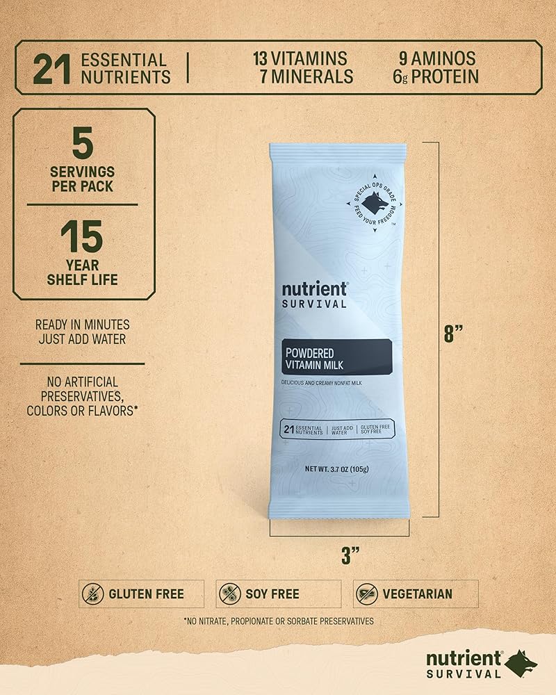 حليب مجفف بالفيتامين من شركة Nutrient Survival (5 حصص فردية) لوازم تحضير مجففة بالتجميد وإمدادات غذائية في حالات الطوارئ، 21 عنصرًا غذائيًا أساسيًا، خالي من الصويا والغلوتين، ثابت على الرف لمدة تصل إلى 15 عامًا