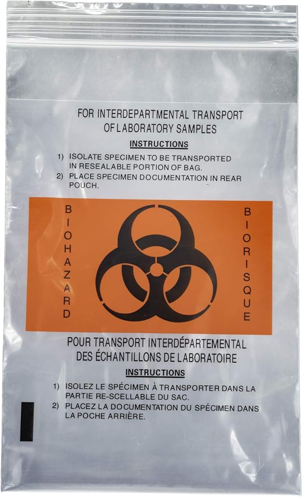 TRANSPARENT DESIGN – Biohazard specimen bags are clear with orange and black print.