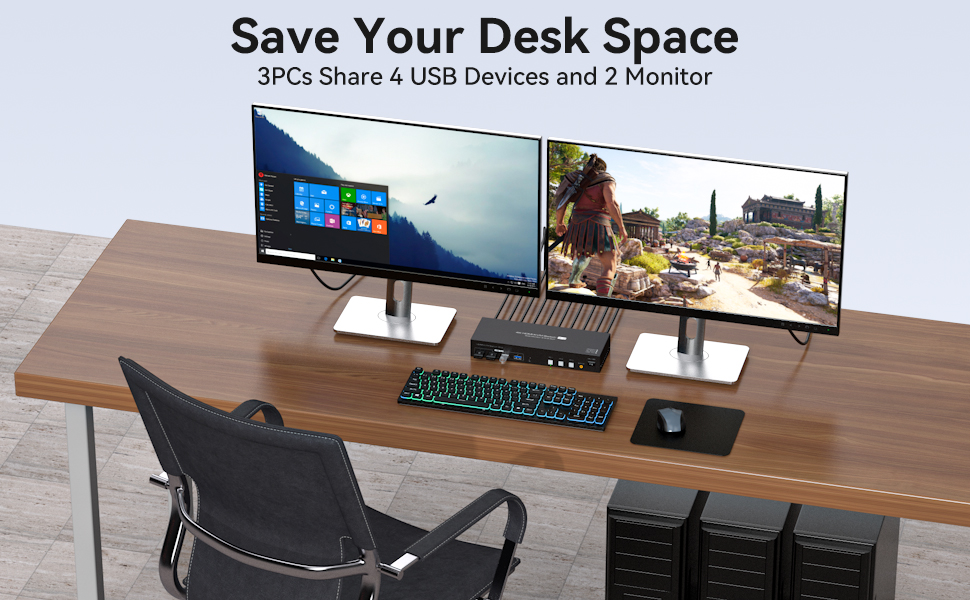 【وضعان للتبديل】توفر شاشات مفتاح kvm 2 وضعين للتبديل: 1. ما عليك سوى الضغط على أزرار PC1 أو PC2 أو PC3 الموجودة على الجهاز للتبديل بين مصادر مختلفة، وسيظهر المؤشر الموجود بجوار الأزرار المصدر الذي تعمل عليه. 2. يتم التبديل عبر جهاز التحكم عن بعد، مما يسمح لك بوضع شاشة HDMI المزدوجة kvm خارج مساحة العمل الخاصة بك، مما يحافظ على سطح المكتب الخاص بك مرتبًا في جميع الأوقات. ملاحظة: اختصارات لوحة المفاتيح (مفاتيح التشغيل السريع) غير مدعومة عند التبديل.