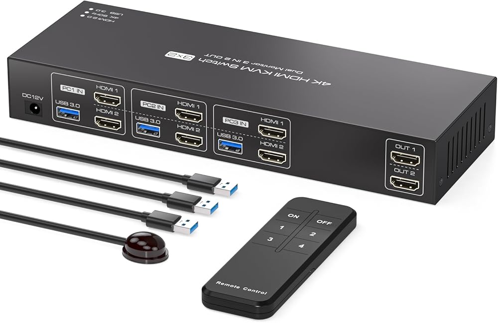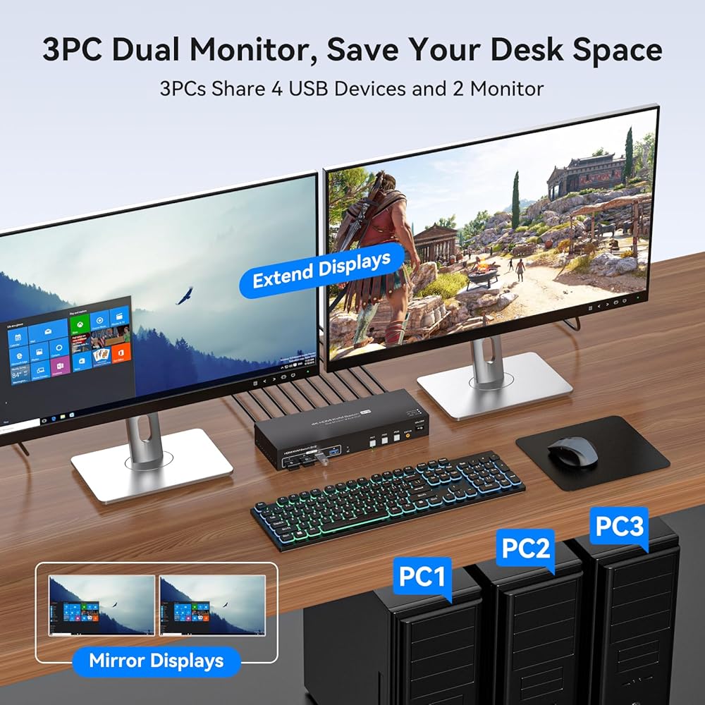 PVBCTCSID KVM Switch 2 شاشات 3 أجهزة كمبيوتر 4K @ 60 هرتز KVM Switch شاشة مزدوجة لـ 3 أجهزة كمبيوتر 2 شاشات مشتركة 4 أجهزة USB 3.0 مع أجهزة التحكم عن بعد وكابل USB