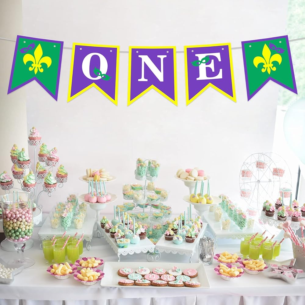 أقنعة ماردي غرا التنكرية واحدة باللون الأرجواني والأخضر الذهبي راية خلفية تاج موضوع ديكور ديكورات لحفلات ماردي غرا كرنفال نيو أورليانز حفلة عيد الميلاد الأول لوازم الحفلات الخلفية