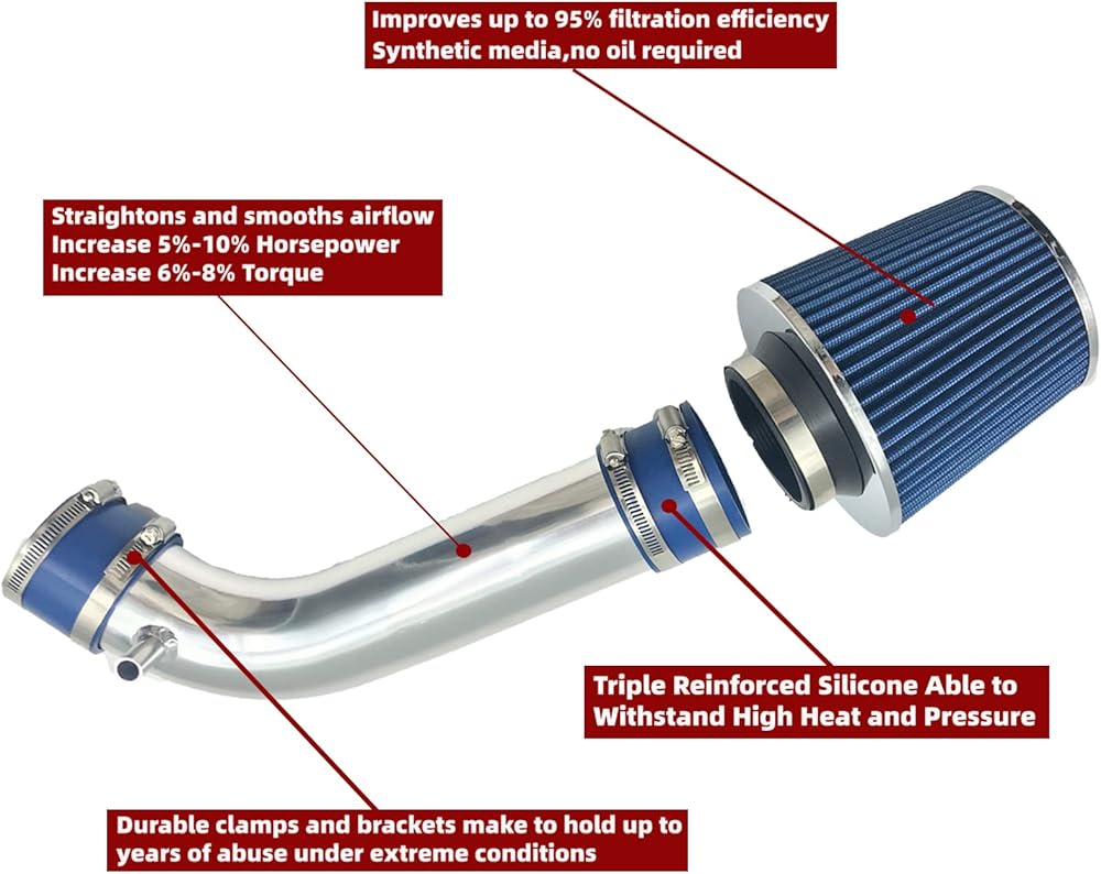 • 【Function】Designed to increasing 5-10% horsepower & 6-8% torque, improve your fuel efficiency and creating an attractive intake noise