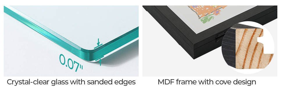 [جودة متينة] مصنوعة من خشب إم دي إف عالي الجودة، وتتميز بملمس ناعم ورقيق مع ملمس شفاف. لا يوفر الزجاج المقسى عالي الجودة المقاوم للكسر رؤية واضحة لأعمالك الفنية فحسب، بل يحمي أيضًا عملك الفني أو ملصقك من الغبار والرطوبة والخدوش.