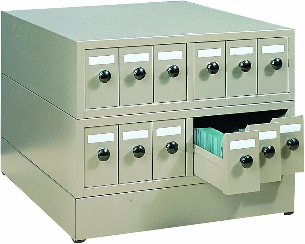 Cabinets are compatible with other cabinets on the market and can be stacked interchangeably. A base unit, sold separately, provides solid support for the cabinet and rests on scratch-proof rubber feet. Base cabinet are available in beige. Drawers have either black phenolic pull knobs or steel handles. Foam rubber dividers keep slides upright when drawers are partially filled. Identification tabs are included for labeling.