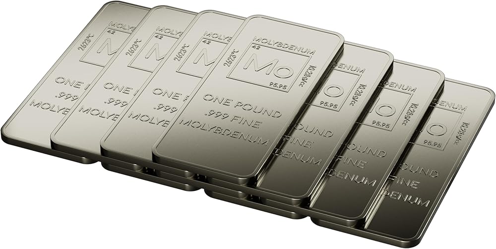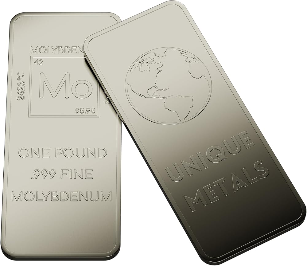 These beautiful Molybdenum bars are made of 99.9% Pure Molybdenum and polished to a beautiful mirror finish. The front of the bar features the Element Symbol - Mo - Atomic Number - 42 - Atomic Mass - 95.95 - Melting Point - 2623°C - Density - 10.28g/cc and reads One Pound .999 Fine Molybdenum. The back of the bar features the Unique Metals Logo. These bars are perfect for bullion investors, collectors, element collectors, gifts to science lovers or whatever else you can think of!