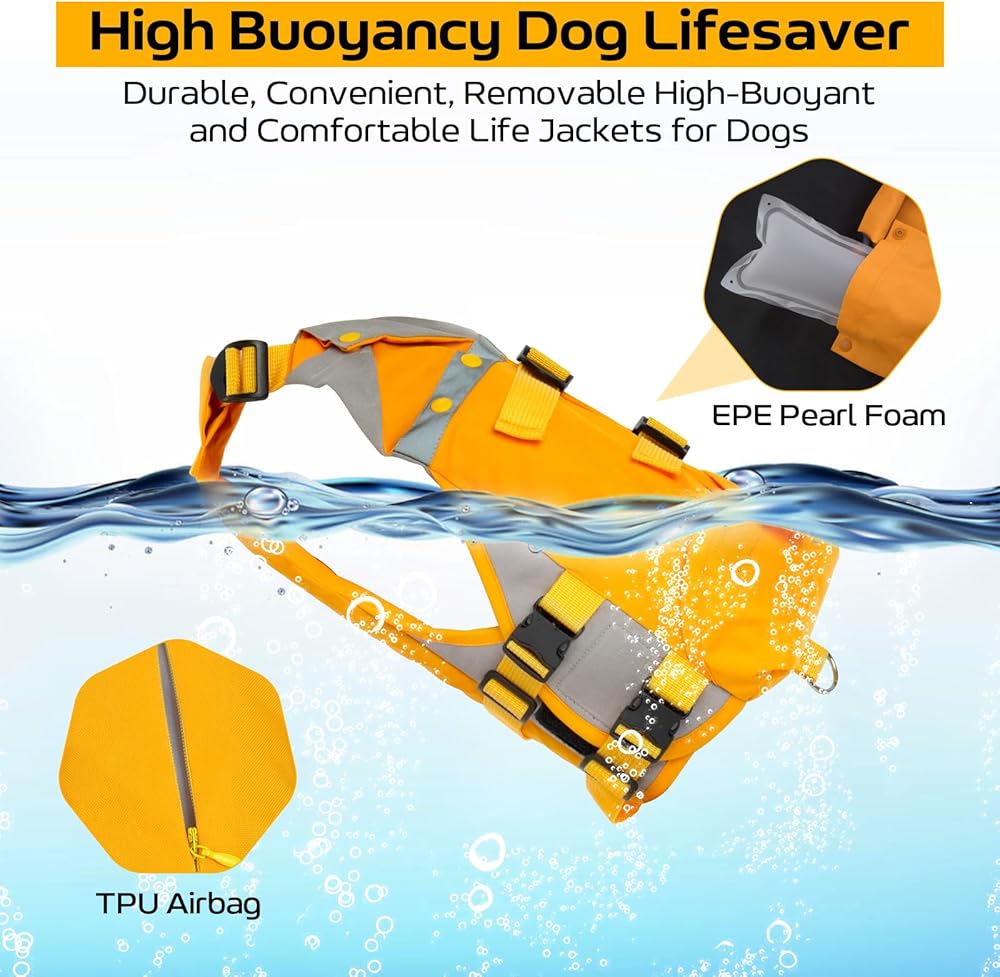 ♥♥ سترة سباحة للكلاب خفيفة الوزن ومتينة ♥♥- سترة نجاة للكلاب لركوب القوارب مصنوعة من قماش أكسفورد والنايلون المقاوم للتمزق، مملوءة بأكياس هوائية من مادة TPU وepe، وهي خفيفة الوزن وقابلة للإزالة. توفر سترة سلامة الكلاب لدينا أيضًا حركة مريحة ولا تقيد الحركة على الأرض أو اللعب في البحر.