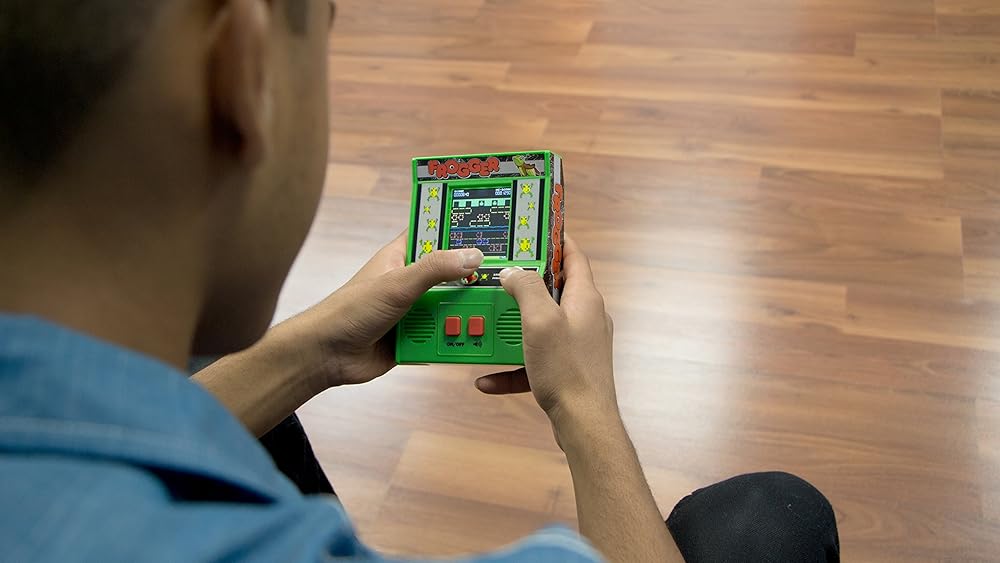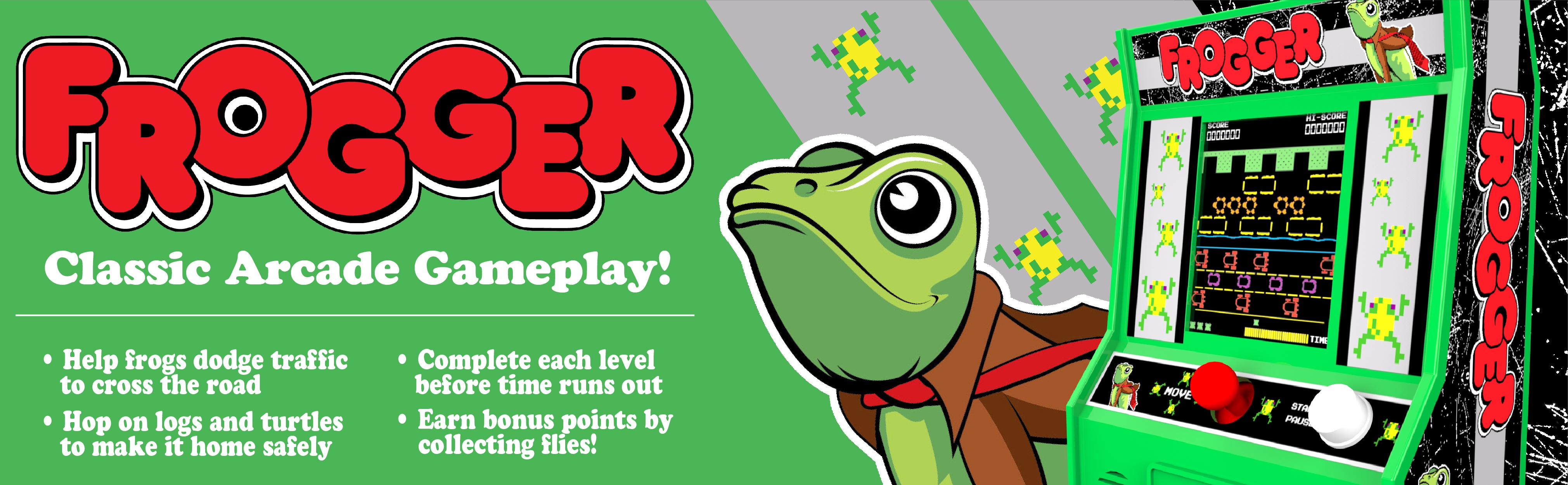 It's a blast from the past with this retro-styled frogger mini arcade game! it looks, sounds and plays just like you remember. Navigate frogger across the highway and the rushing River to the safety of home. Watch out for traffic, and don't fall in the water! includes 3 AA batteries.