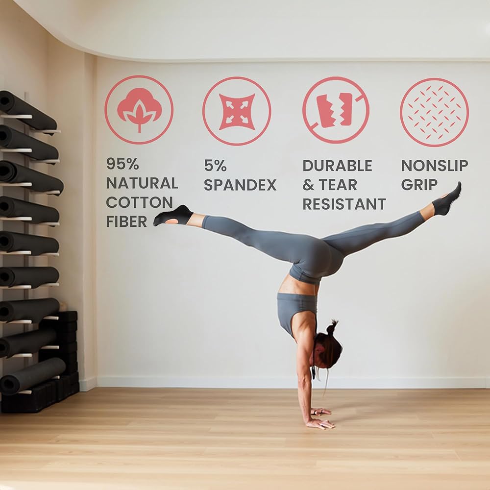 جودة فاخرة - جوارب اليوجا ذات المقابض للسيدات مصنوعة من مزيج ممتاز من 95% قطن، و5% ألياف لدنة، ونقاط من البولي فينيل كلوريد، مما يضمن ملاءمة ناعمة ومريحة تناسب قدميك. توفر هذه الجوارب راحة لا مثيل لها وتمنحك أقصى قدر من الاحتكاك أثناء التدريبات أو جلسات اليوغا.