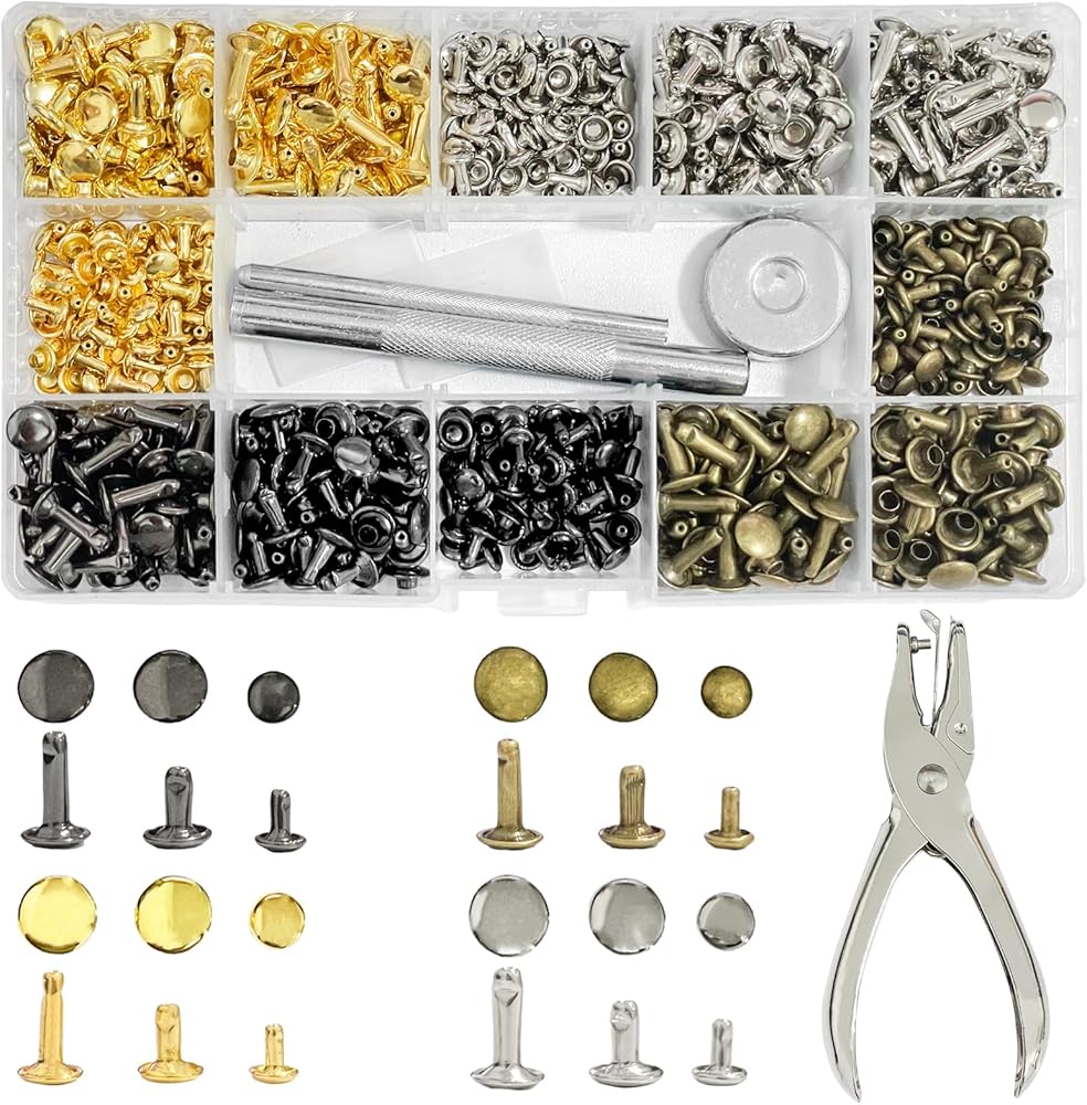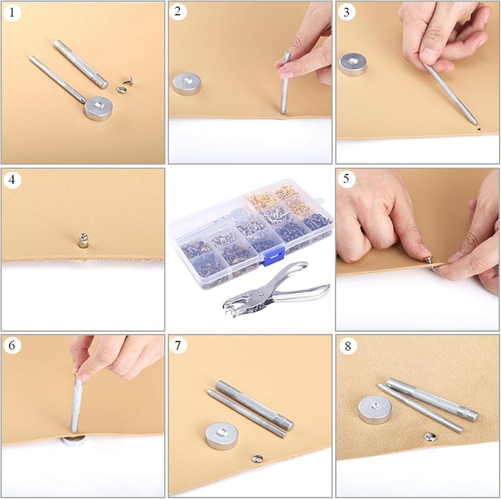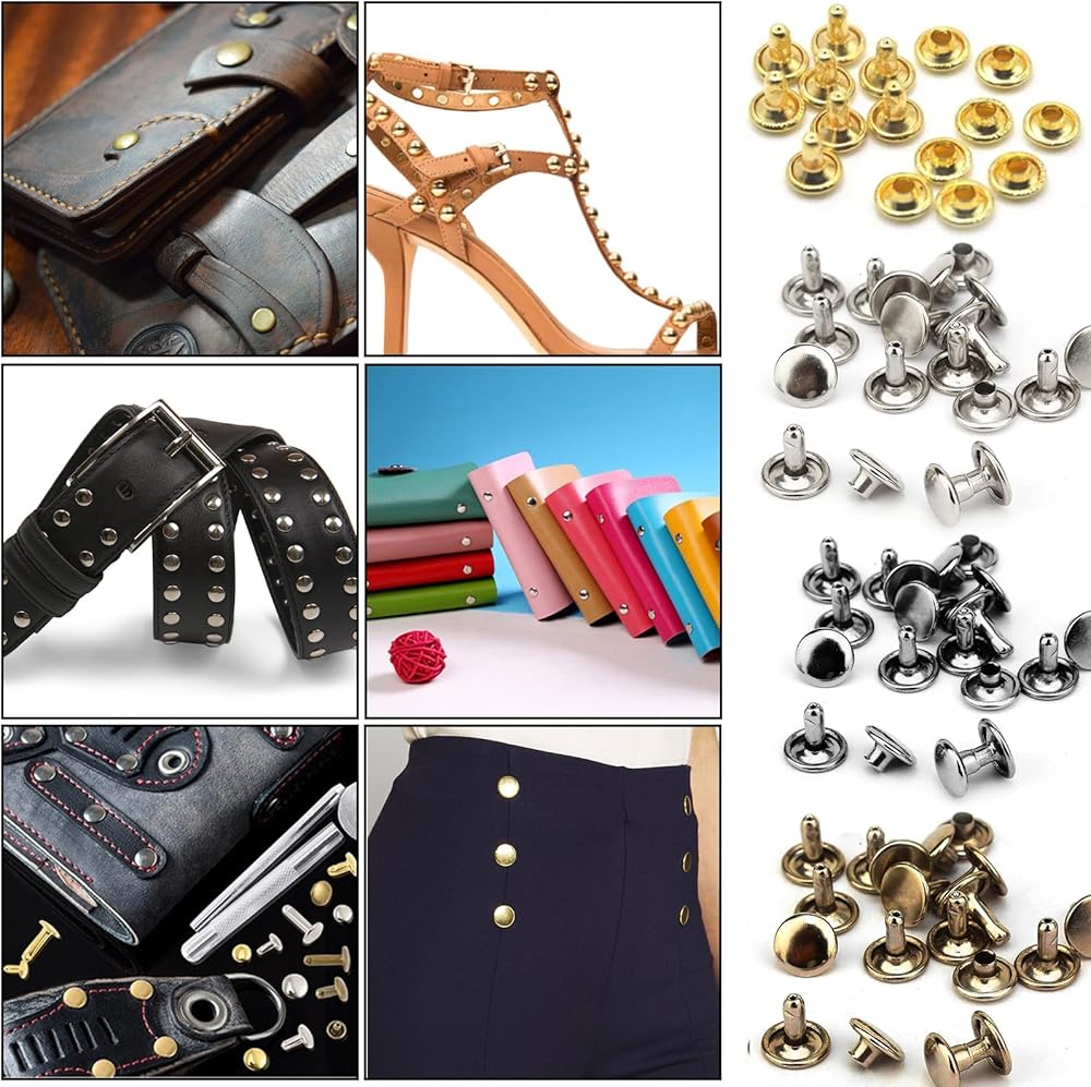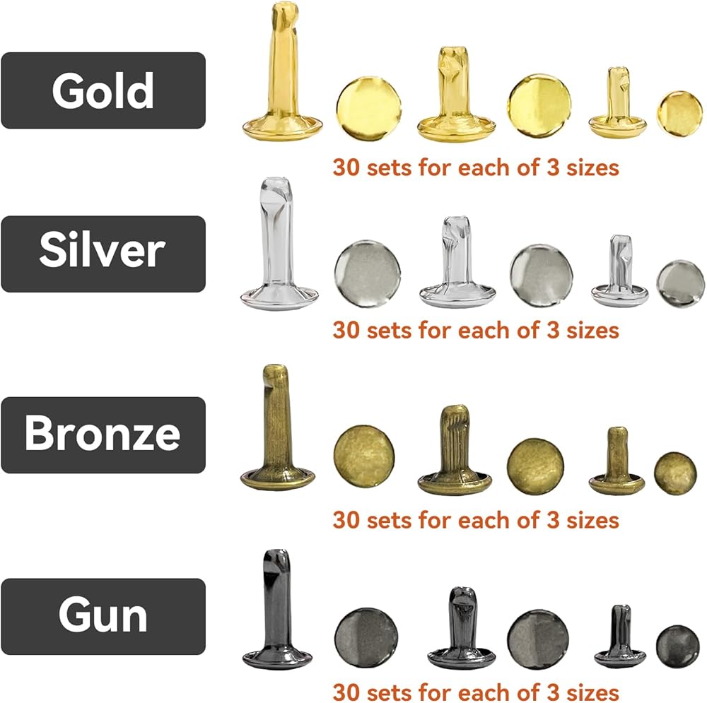 • ❤【Package Includes】 This rivet kit contains 360 rivets+3 fastening tools +1 punch pliers. 3 different sizes (6*6mm, 8*8mm, 8*12mm), each model comes in 4 colours (gold, silver, bronze, gunmetal). Therefore, you can choose the suitable rivets according to your needs.
