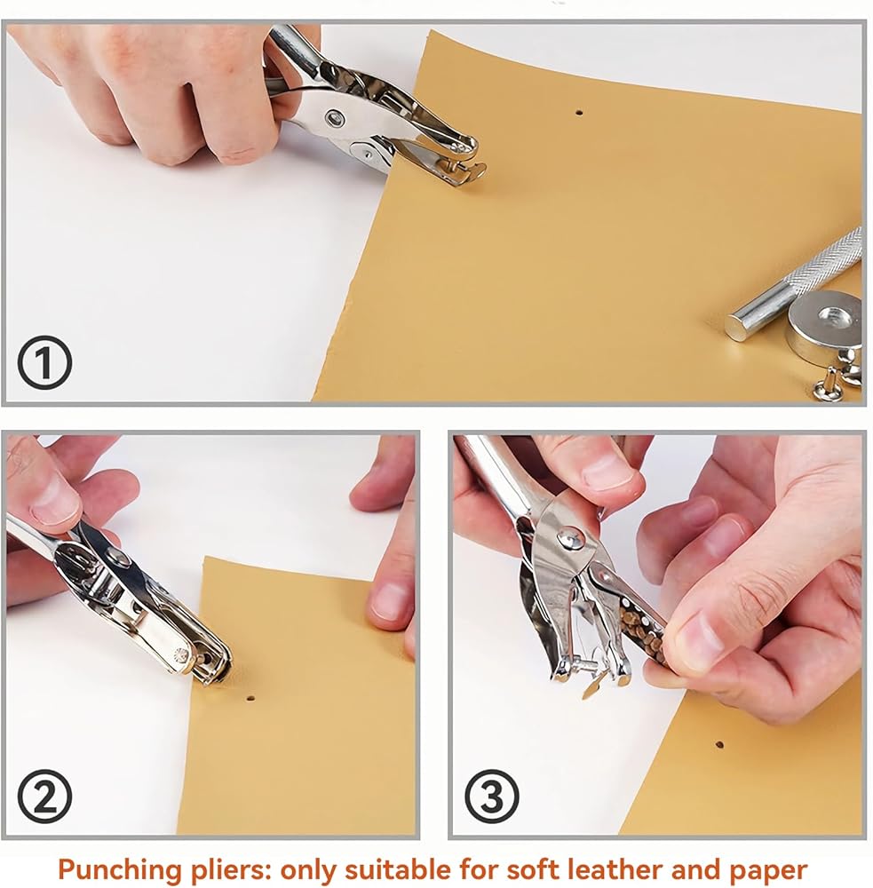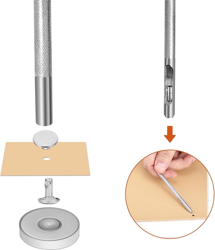 • ❤【Practical Tools】 1 double-sided metal base, 1 hole rod, 1 rivet installation rod, and 1 pliers. Drilling tools can help drill holes in products. There are circular grooves of 8mm and 6mm on the base, which can fix the rivets and prevent them from sliding or hitting. (Note: Pliers are simple and practical tools. If you need to press thick materials, please use the accompanying stamping rod or a more professional stamping tool.)