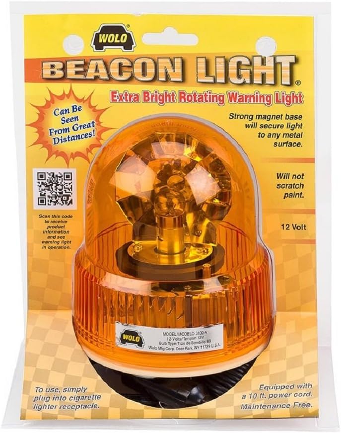 The Wolo 3110-R is a super bright 12-volt rotating warning light with a bulb that produces eight candlepower which is magnified by a chrome Fresnel reflector. Produces 60 flashes per minute with a permanent magnet low noise motor. Lens and base are both made of strong ABS plastic. The base has three (3) powerful protected magnets that will secure the light to any metal surface. Includes a 10 ft. wire with cigarette lighter plug.