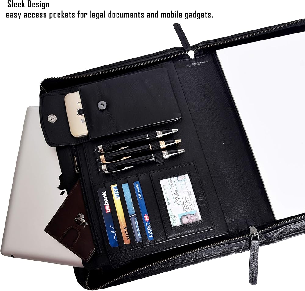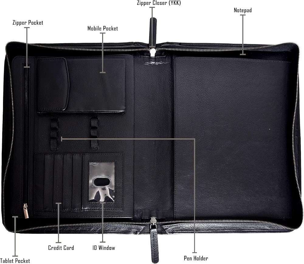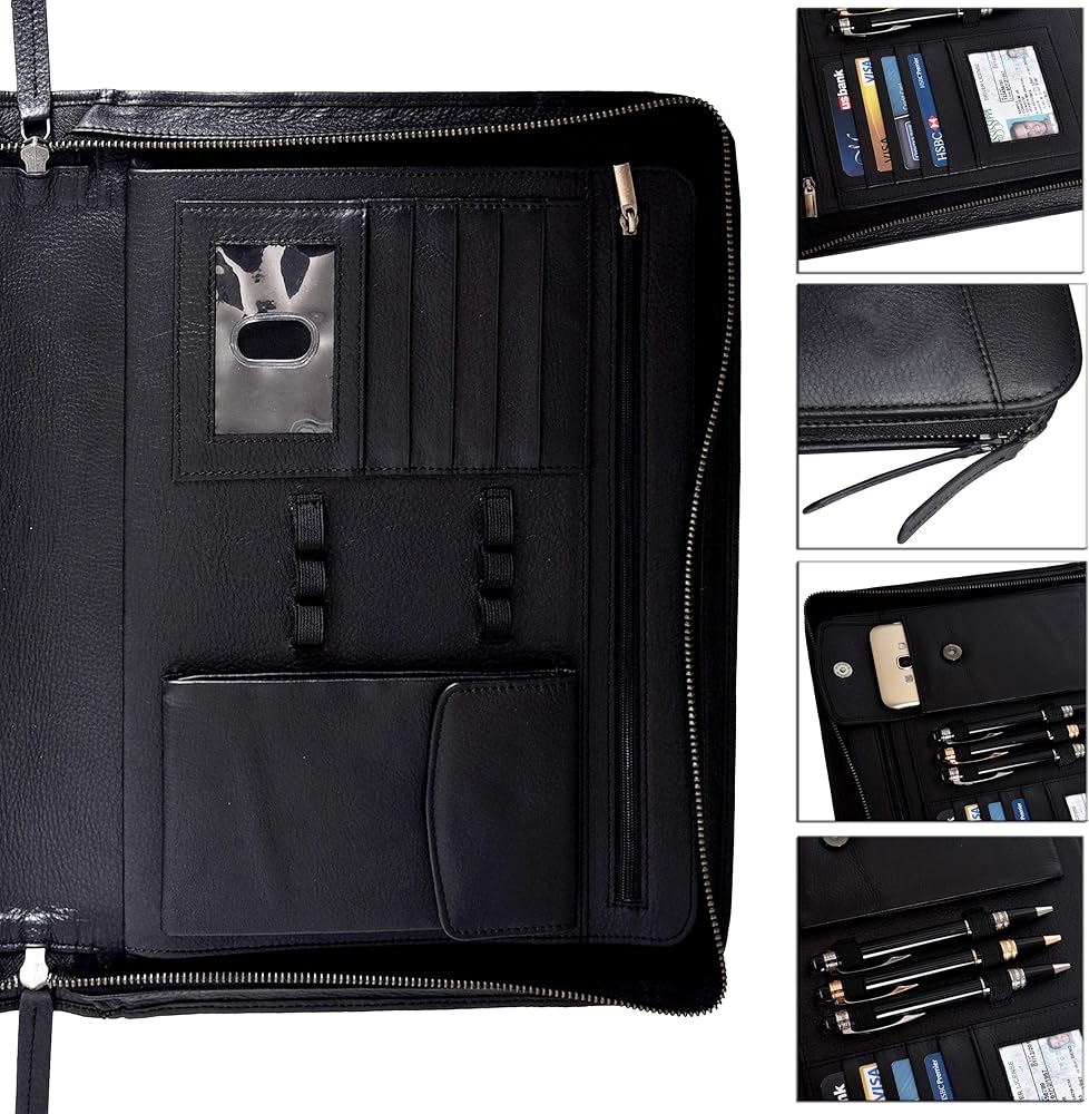 • مجلد بسحاب بسعة تخزين عالية: يبلغ مقاس الوسادة المصممة 13.75 × 11.10 بوصة لحمل جميع أساسيات العمل والمستندات القانونية أو بحجم الحروف بسهولة. تحتوي على 4 جيوب كبيرة، وجيب واحد للكمبيوتر اللوحي، وجيب داخلي بسحاب، و4 فتحات بطاقات لتخزين بطاقات العمل أو الائتمان/الخصم، ونافذة واحدة لبطاقة الهوية، و3 حاملات أقلام، وجيب واحد لتخزين هاتفك الخلوي أو التقويم أو الآلة الحاسبة. لتوفير الأمان الأمثل للمستندات المهمة، يتم تأمين الحافظة بسحاب ملتف عالي التحمل.