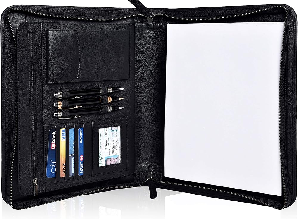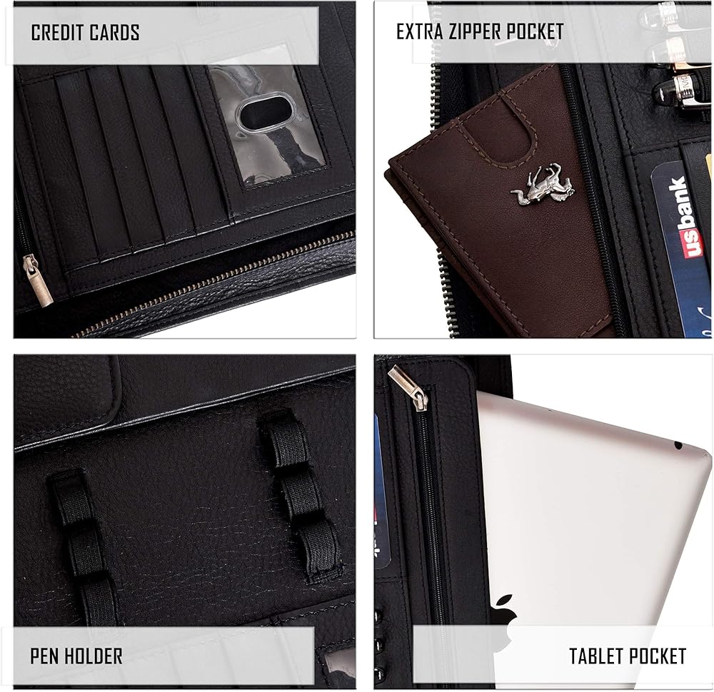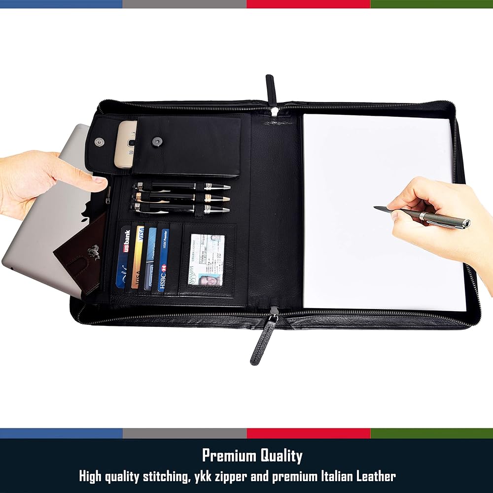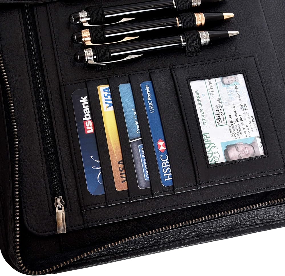 • مجلد بسحاب بسعة تخزين عالية: يبلغ مقاس الوسادة المصممة 13.75 × 11.10 بوصة لحمل جميع أساسيات العمل والمستندات القانونية أو بحجم الحروف بسهولة. تحتوي على 4 جيوب كبيرة، وجيب واحد للكمبيوتر اللوحي، وجيب داخلي بسحاب، و4 فتحات بطاقات لتخزين بطاقات العمل أو الائتمان/الخصم، ونافذة واحدة لبطاقة الهوية، و3 حاملات أقلام، وجيب واحد لتخزين هاتفك الخلوي أو التقويم أو الآلة الحاسبة. لتوفير الأمان الأمثل للمستندات المهمة، يتم تأمين الحافظة بسحاب ملتف عالي التحمل.