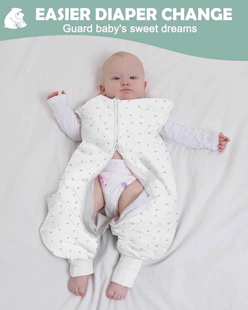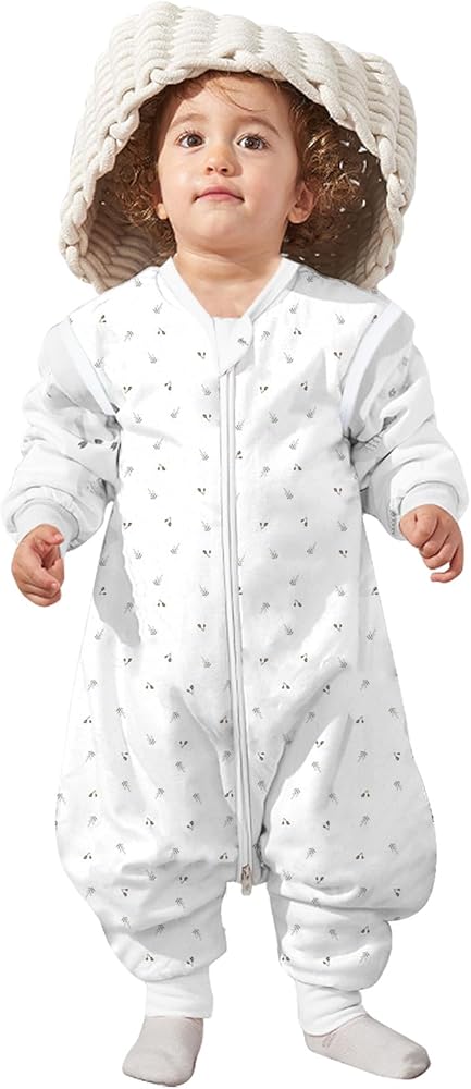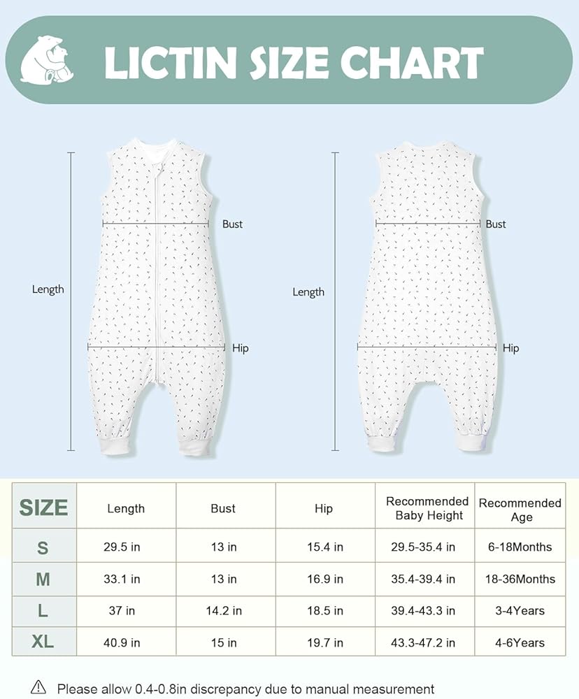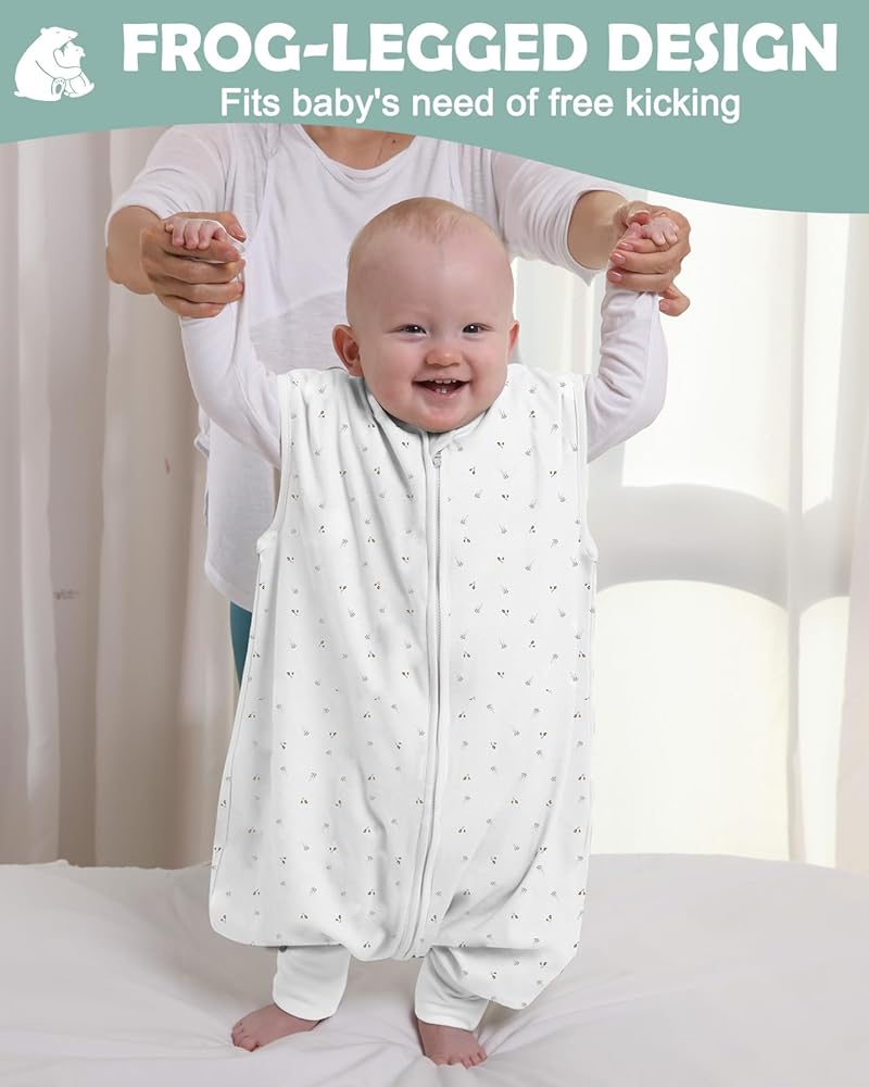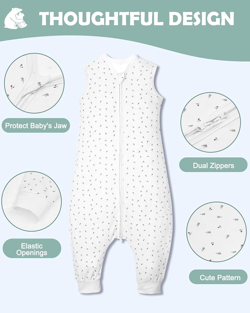 【تصميم مقسوم الساق وبدون أكمام】تتميز حقيبة نوم الأطفال الصغار لدينا بتصميم مقسوم الساق وبدون أكمام لضمان درجة حرارة مريحة للساق وزيادة تبديد الحرارة عند الذراعين، مع السماح بنمو الذراع والورك بشكل غير مقيد.