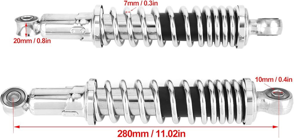 Feature:1. Built to meet standard specification, simple to install, better deal with rough roads.Specification:Item Type:Shock Absorber Material:Steel Alloy Color:As Picture Shown Hole Distance:Approx. 280mm 11.02in Fitment:Fit for Honda Z50 Fit for Monkey Z50 DAX JC70 Fit for all other motorcycles with a hole diameter of 280mm Fit for E-Bike Electric dirt pit bike Scooter ATV Quad Go karts Package List:2 x Shock Absorber Note:1. Please allow 0‑1 inch error due to manual measurement. Thanks for your understanding.2. Monitors are not calibrated same, item color displayed in photos may be showing slightly different from the real object. Please take the real one as standard.